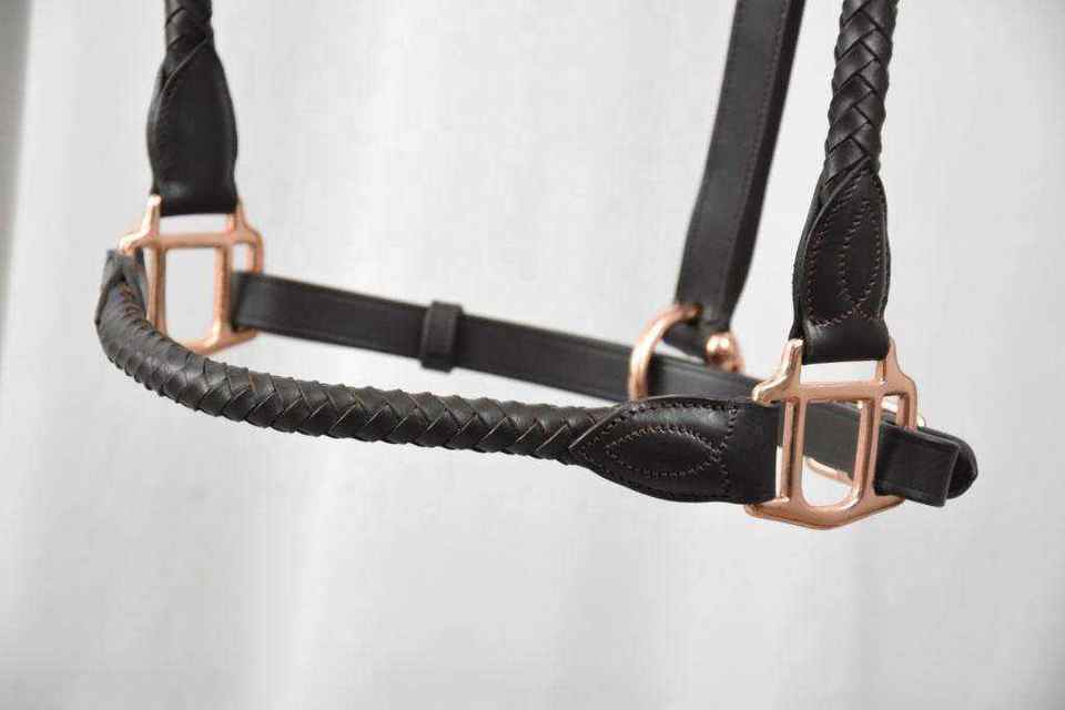 สายจูงม้าหนังแท้คุณภาพพรีเมียม แบบถัก ปรับได้ พร้อมอุปกรณ์ตกแต่งสีโรสโกลด์สุดหรู เหมาะสำหรับการขี่ม้าและการแข่งขัน