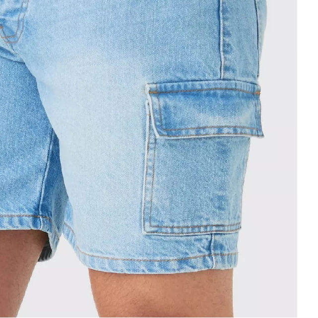 กางเกงขาสั้นเดนิมผู้ชายสีฟ้าอ่อนพรีเมียม พร้อมกระเป๋าข้าง ทรงคลาสสิก เย็บอย่างทนทาน เหมาะสำหรับใส่ในฤดูร้อน