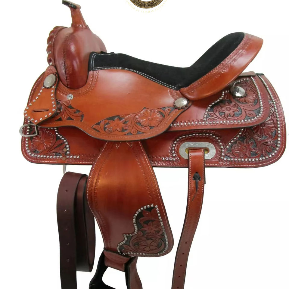 อานม้าหนังแท้น้ำหนักเบาพรีเมี่ยมสไตล์ตะวันตกทำด้วยมือสำหรับการแสดงโรดิโอแบบกระบอกสวมใส่สบาย