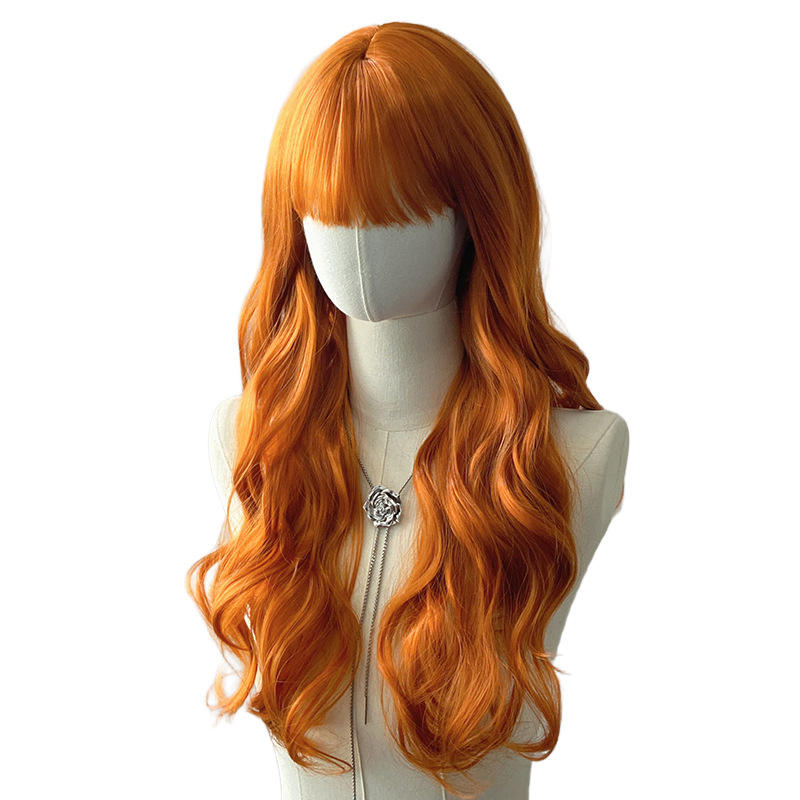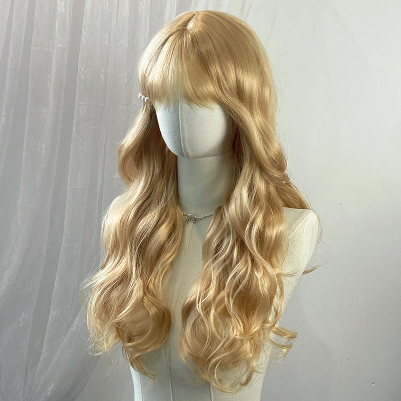 Premium Long Body Wave French Curl Natural Highlights Brown Wig Bangs for Women Heat Resistant Synthetic Hair 25 Inch Length