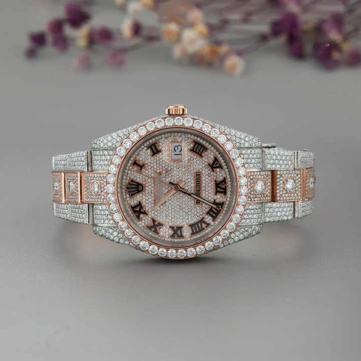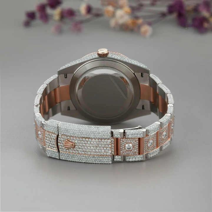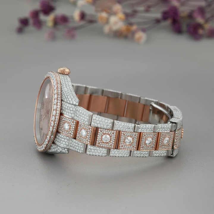 นาฬิกาหรูหราพรีเมียมประดับเพชรโมอิสซาไนต์เต็มเรือน ตัวเรือนโรสโกลด์ หน้าปัดเงางาม สายนาฬิกาแบบควอตซ์ สำหรับผู้ชาย เครื่องประดับแฟชั่นฮิปฮอป