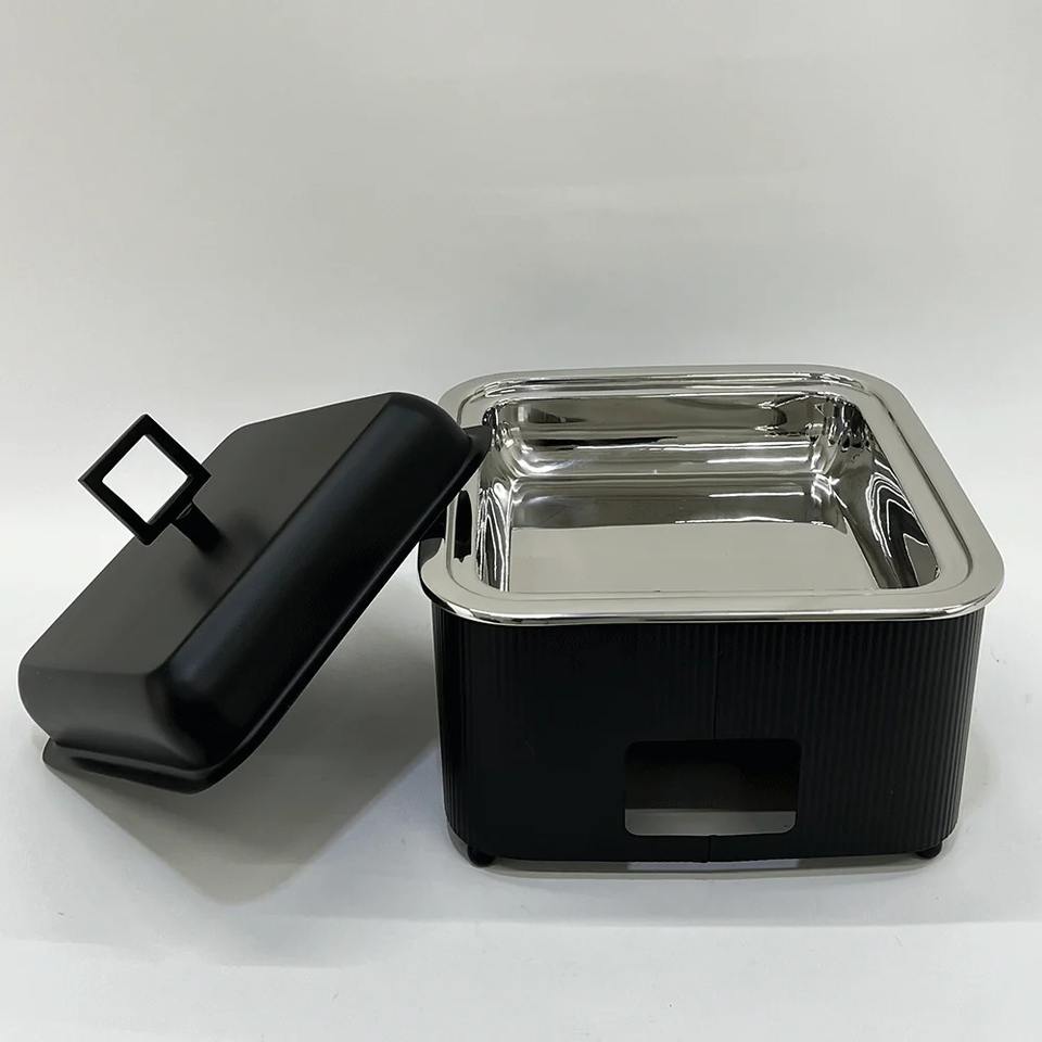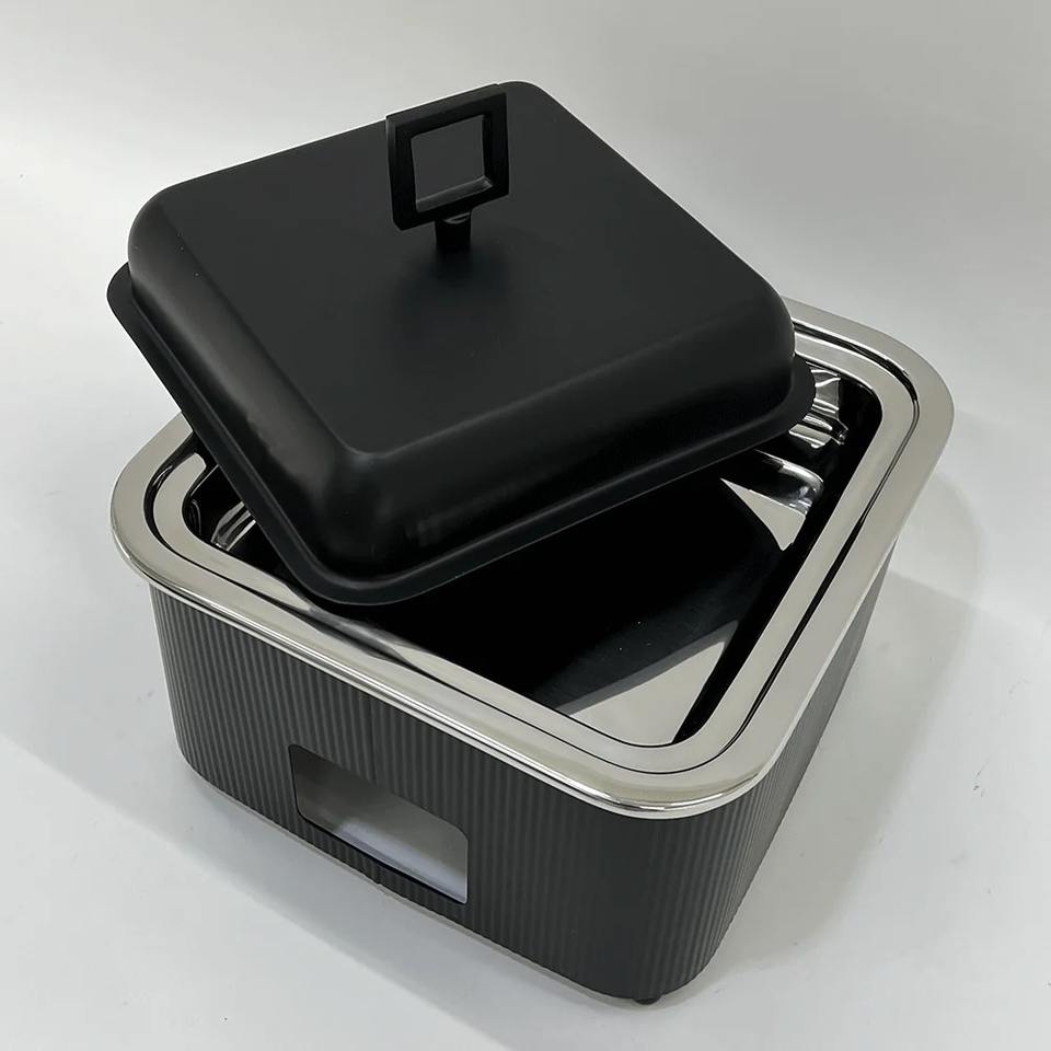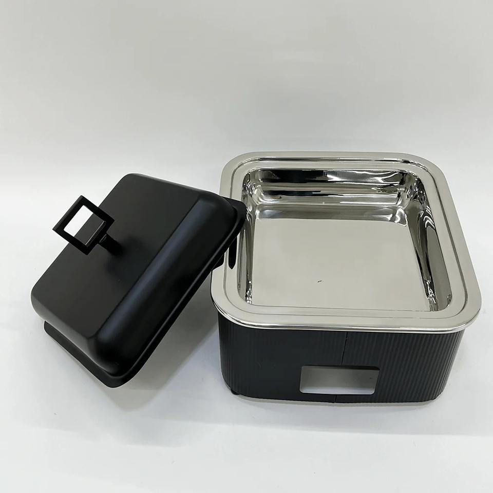 ถาดอุ่นอาหารบุฟเฟ่ต์สี่เหลี่ยมสแตนเลสสีดำด้านแบบพรีเมียมหรูหรา ฝาปิดกันติด ทนทาน เหมาะสำหรับงานจัดเลี้ยง