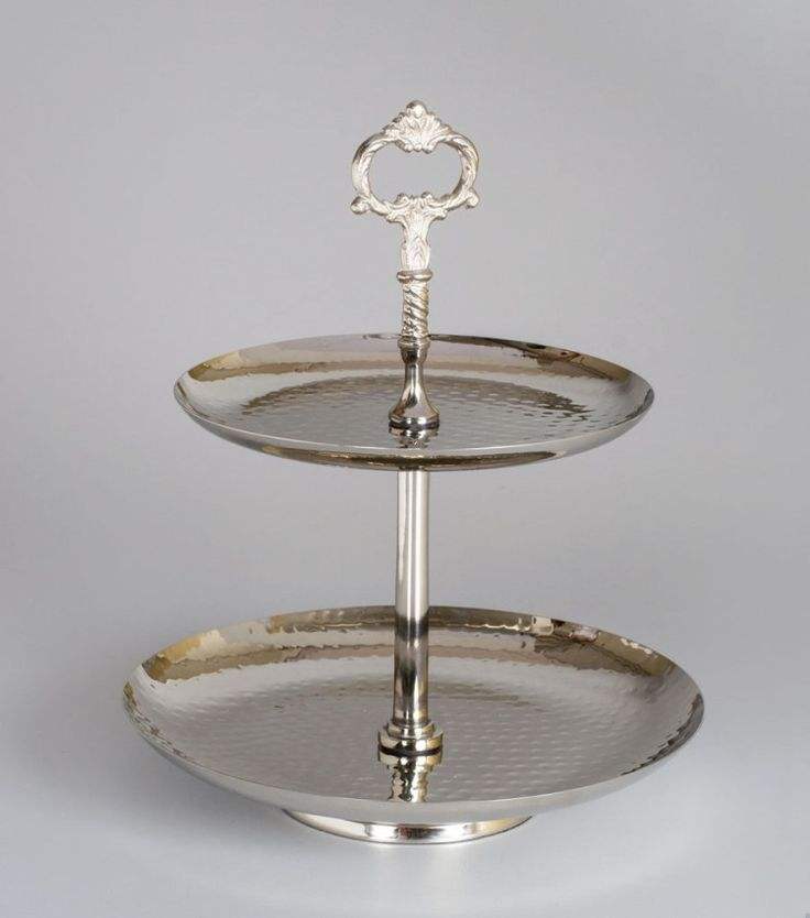 ชั้นวางเค้กโลหะสองชั้นแบบพรีเมียมหรูหรา พร้อมห่วงจับสีทองเงิน สำหรับจัดแสดงขนมหวานในงานแต่งงานและงานเลี้ยงบนโต๊ะ