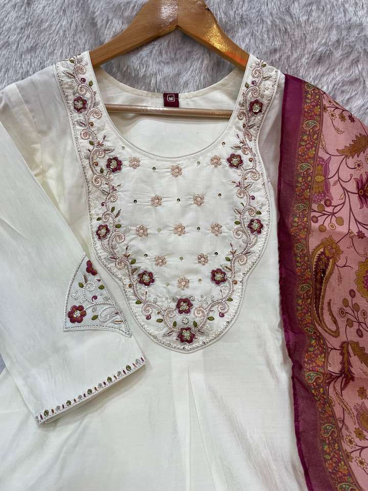 ชุดคุर्ติผ้าไหมปักลายพรีเมียมพร้อมกางเกงขายาว และผ้าคลุมไหล่ผ้าไหมซารานาพิมพ์ลายดิจิทัล