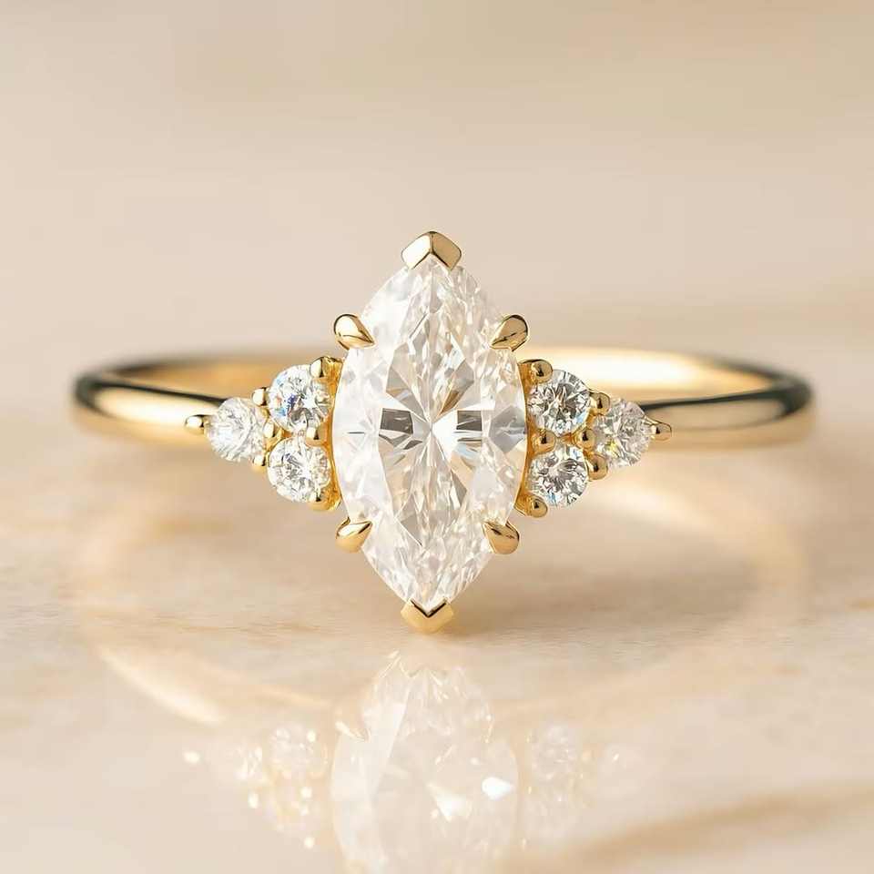 แหวนเพชรทรงมาร์คีส์เจียระไนแบบบริลเลียนท์คัท ผลิตในห้องปฏิบัติการ พร้อมตัวเรือนทองคำ ดีไซน์หรูหราสำหรับงานแต่งงานและหมั้น สีเหลือง ขาว และโรสโกลด์