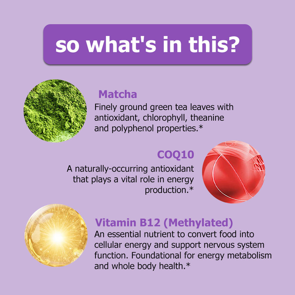ส่วนผสมหลัก:ชาเขียวมัทฉะ, โคเอนไซม์ คิวเท็น, วิตามินบี 12