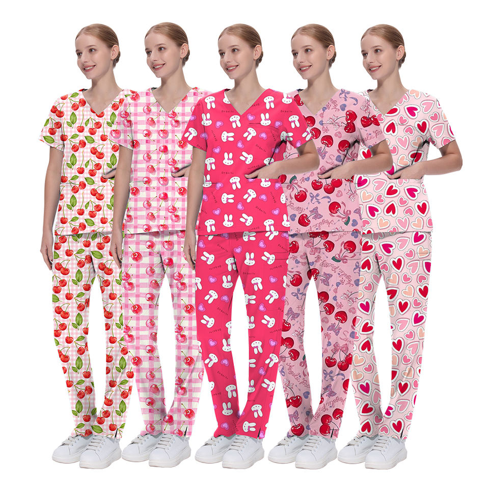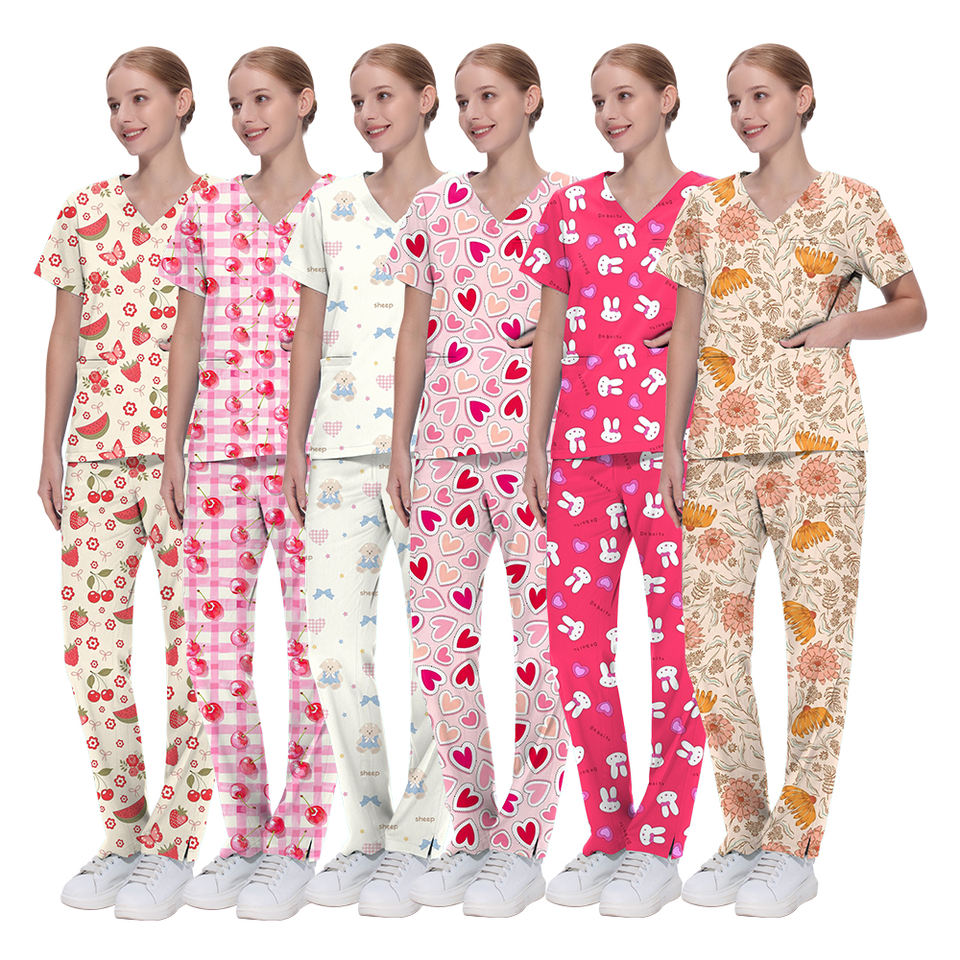 ชุดเสื้อสครับพิมพ์ลายทางการแพทย์แบบพรีเมี่ยมชุดเครื่องแบบ2ชิ้นสำหรับงานดูแลสุขภาพเนื้อนุ่มทนทานและทันสมัย