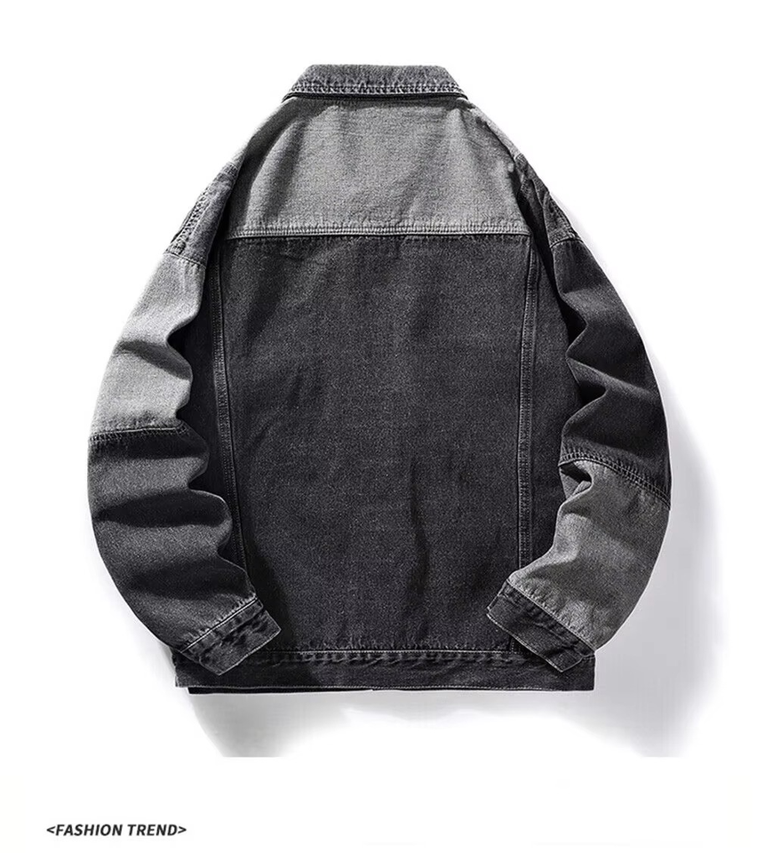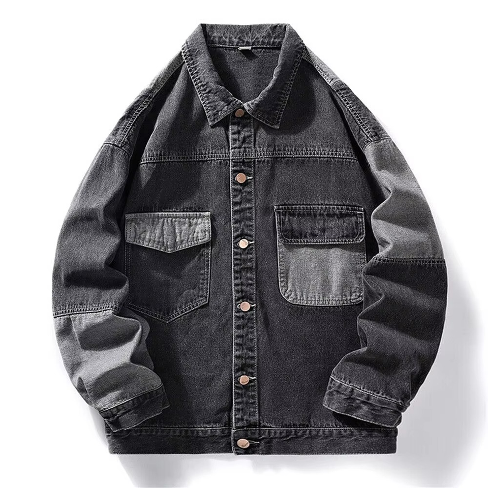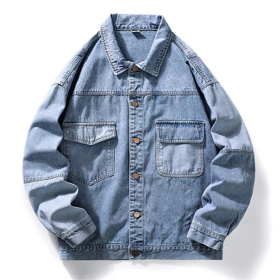 แจ็คเก็ตยีนส์ผู้ชายพรีเมียม หนังแกะเคลือบ ปกตั้ง ระบายอากาศ กันลม ปรับแต่งสีได้ พิมพ์ลายด้านหน้า สไตล์ลำลอง