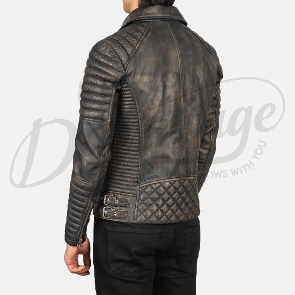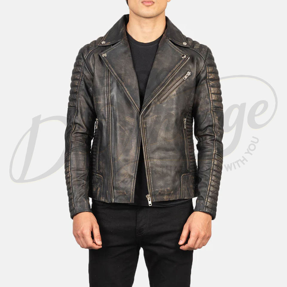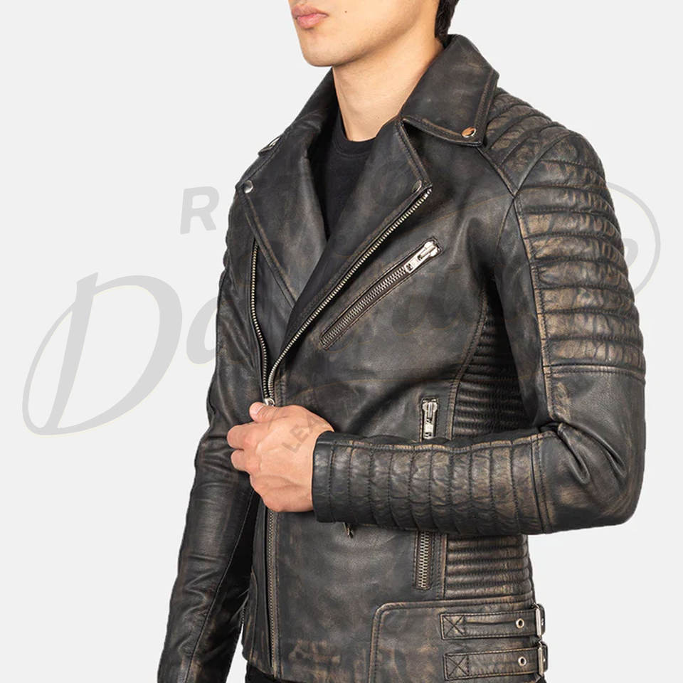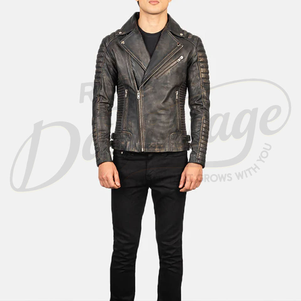 แจ็คเก็ตหนังแท้สีเทาสไตล์ไบค์เกอร์สำหรับผู้ชาย รุ่นพรีเมียม แต่งลายควิลท์ที่ไหล่ ทรงเข้ารูป สไตล์วินเทจ