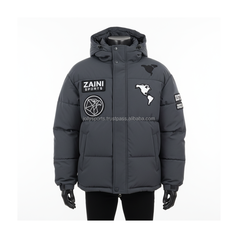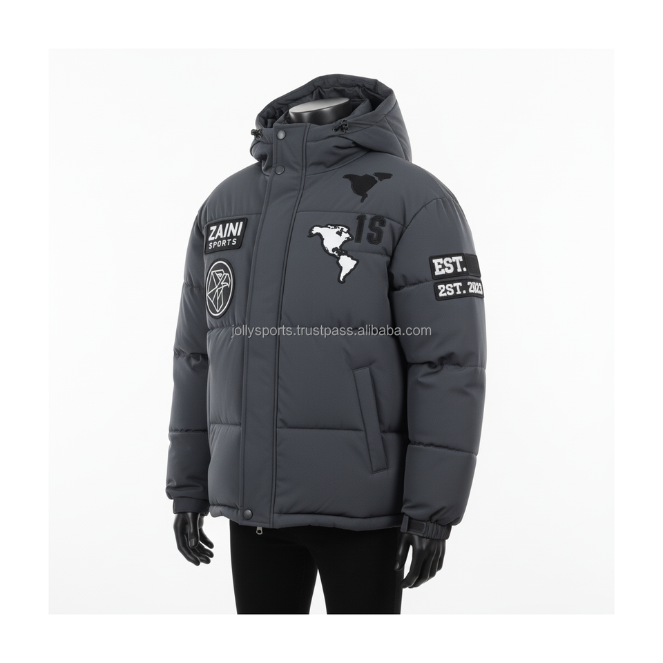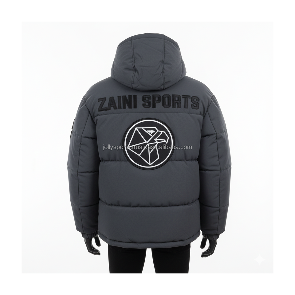 เสื้อแจ็คเก็ตขนเป็ดสำหรับผู้ชายเสื้อแจ็คเก็ตขนเป็ด380GSM กันลมโพลีเอสเตอร์ปักโลโก้ออกแบบได้ตามต้องการ