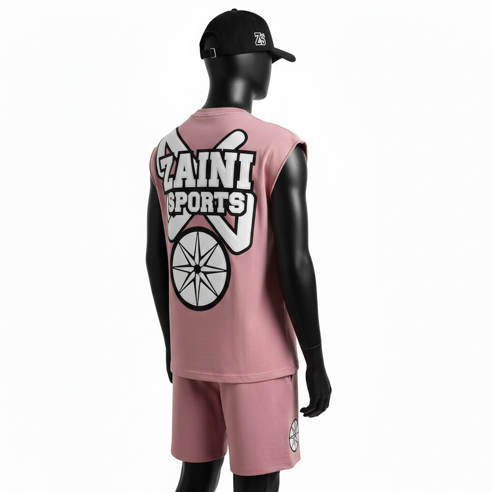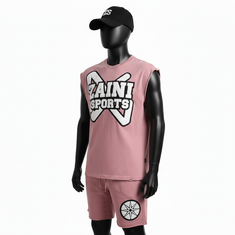 ชุดเสื้อยืดแขนกุดพรีเมียมสำหรับผู้ชาย ผ้าคอตตอนเจอร์ซีย์ GSM ระบายอากาศได้ดี สีชมพู พร้อมโลโก้แบบกำหนดเอง ชุดเสื้อยืดแขนกุดและกางเกงขาสั้นสำหรับผู้ชาย