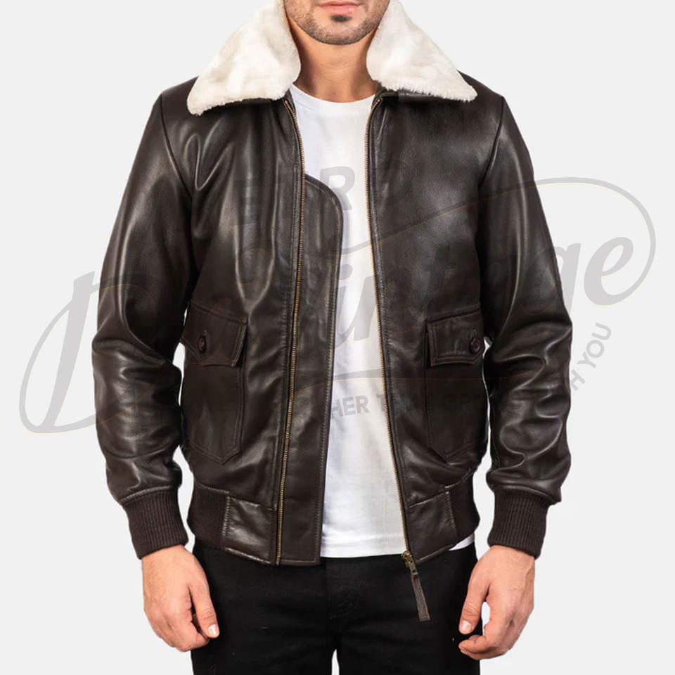 แจ็คเก็ตบอมเบอร์หนังสีน้ำตาลเข้มสำหรับผู้ชายพร้อมปกขนเฟอร์สีขาว แจ็คเก็ตนักบินคลาสสิก เสื้อคลุมกันหนาวสำหรับฤดูหนาว