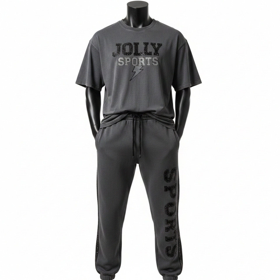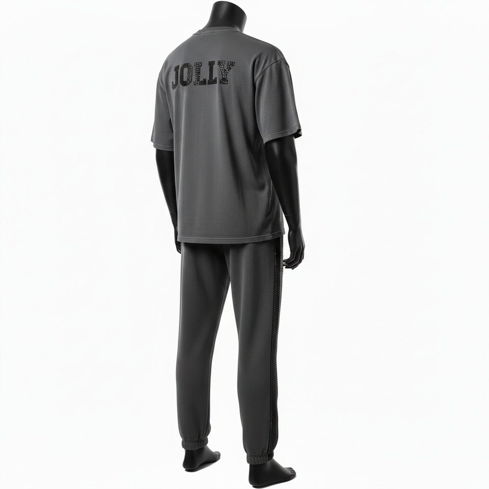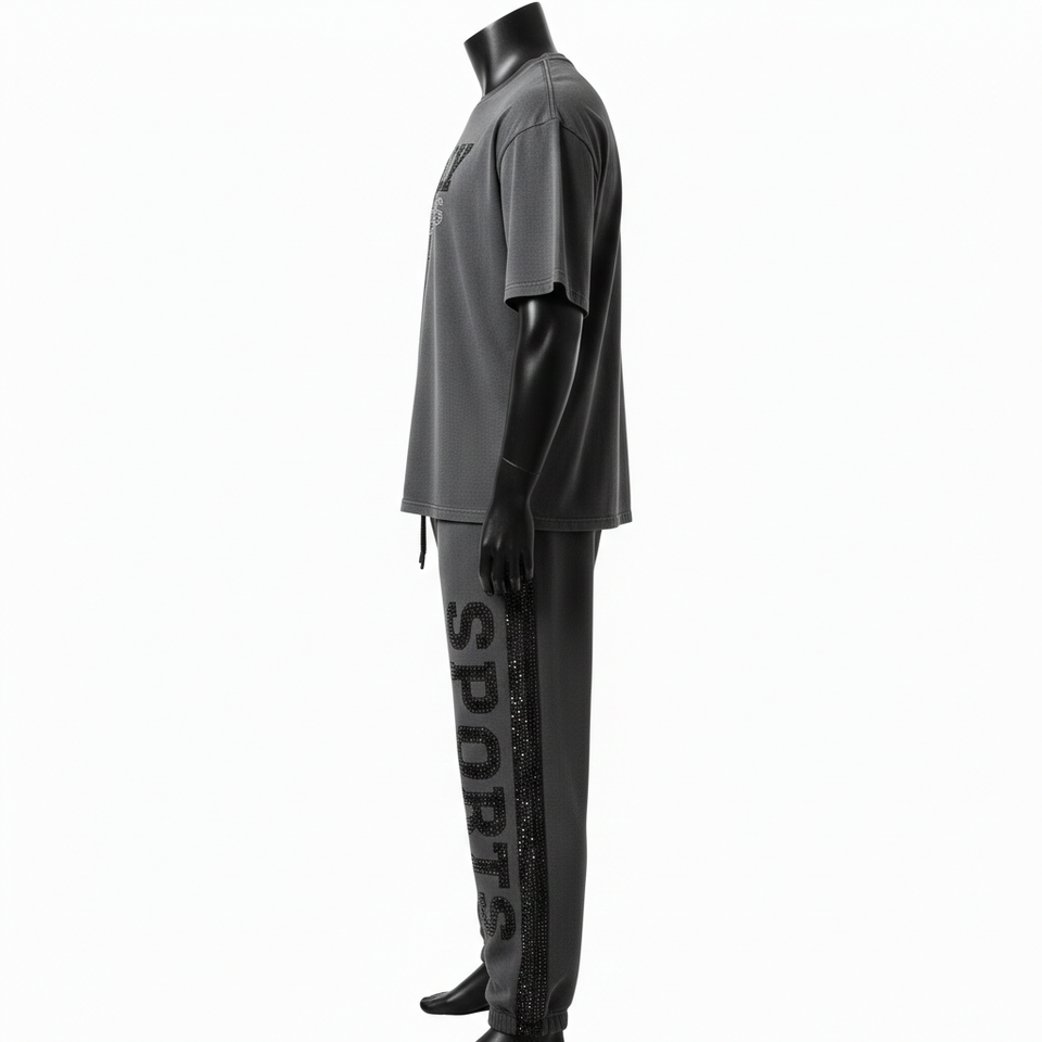 ชุดเสื้อยืดและกางเกงขายาวผู้ชายพรีเมียม สีเทาเข้ม ผ้าคอตตอนผสมโพลีเอสเตอร์ GSM พร้อมโลโก้คริสตัลแบบรีดร้อน พิมพ์ลายตามสั่ง