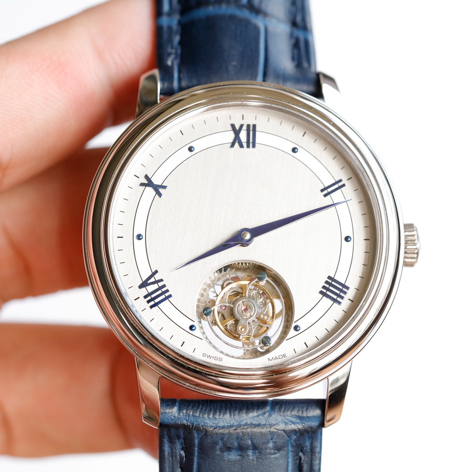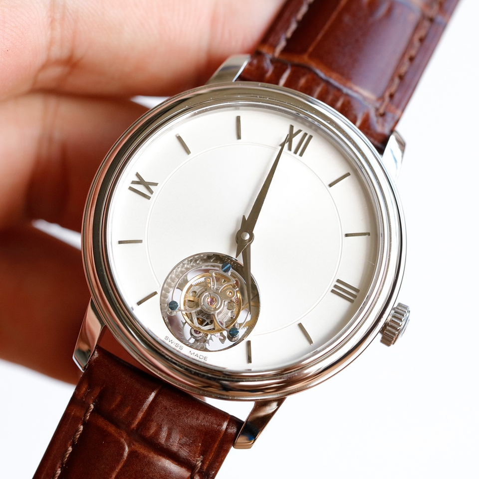 นาฬิกา Tourbillon สำหรับผู้ชายแบบพรีเมี่ยมตัวเรือนสีเงินหน้าปัดสีขาวสายหนังจระเข้สีน้ำตาลตัวเรือนทำจากสวิส