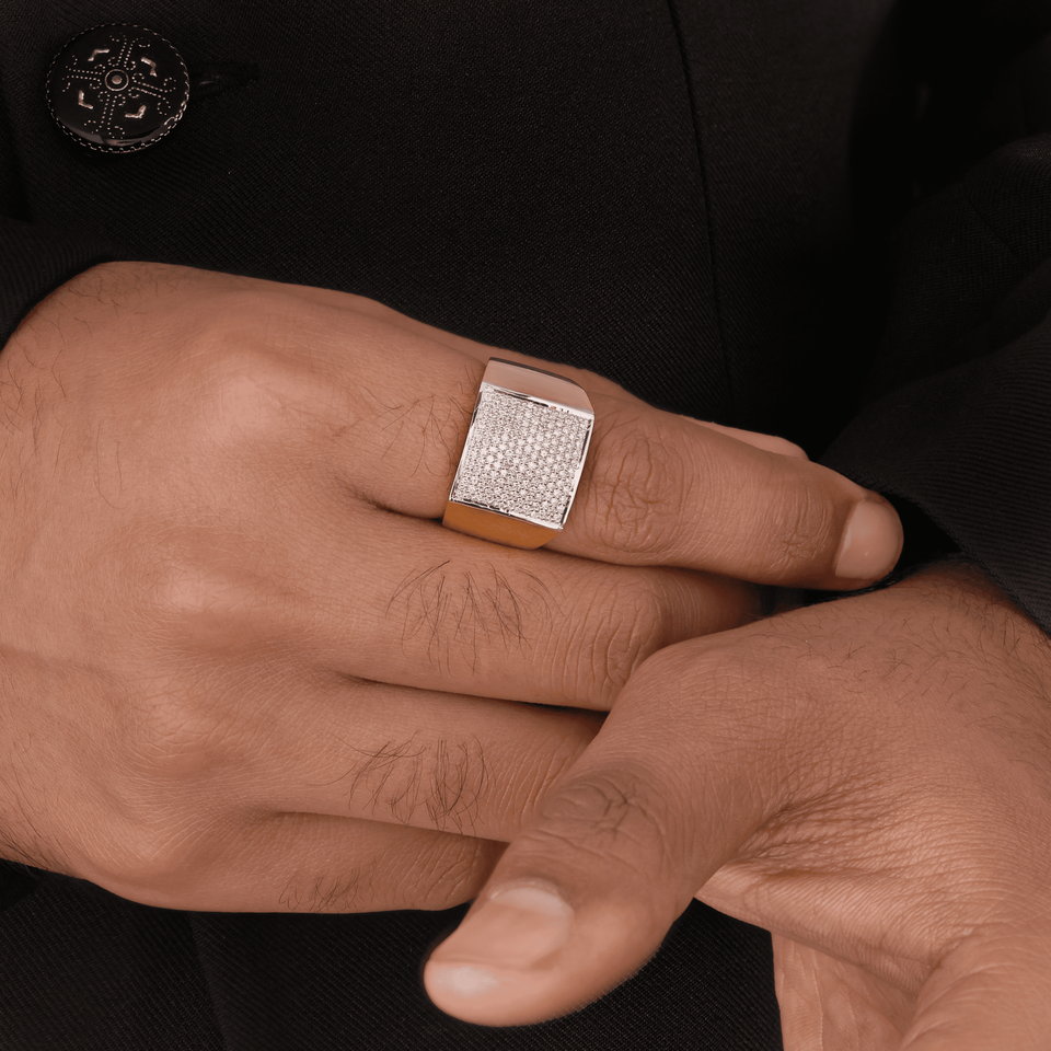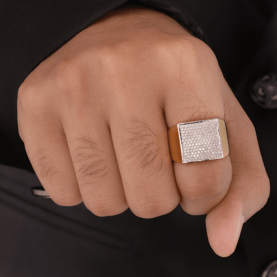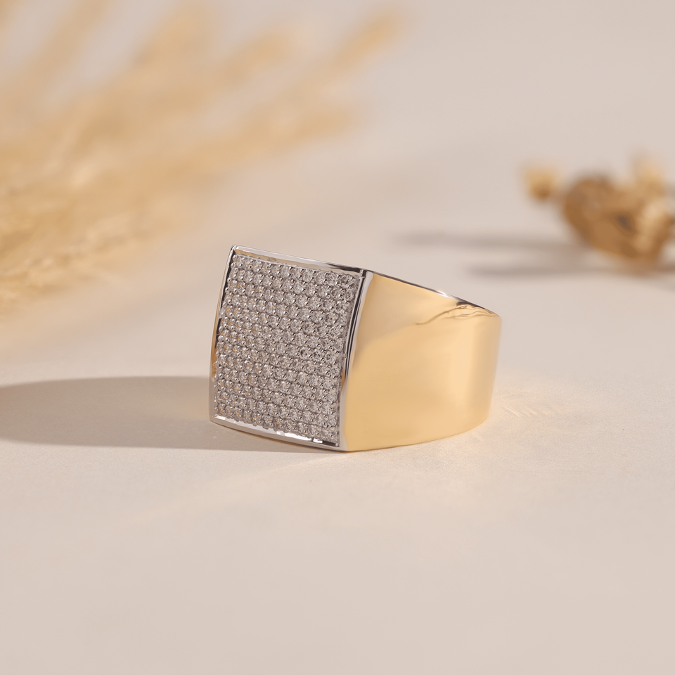 แหวนตราประทับเพชรสำหรับผู้ชายระดับพรีเมียม ประดับด้วยไมโครเพฟเซ็ตติ้ง ชุบทอง - เครื่องประดับชั้นดี