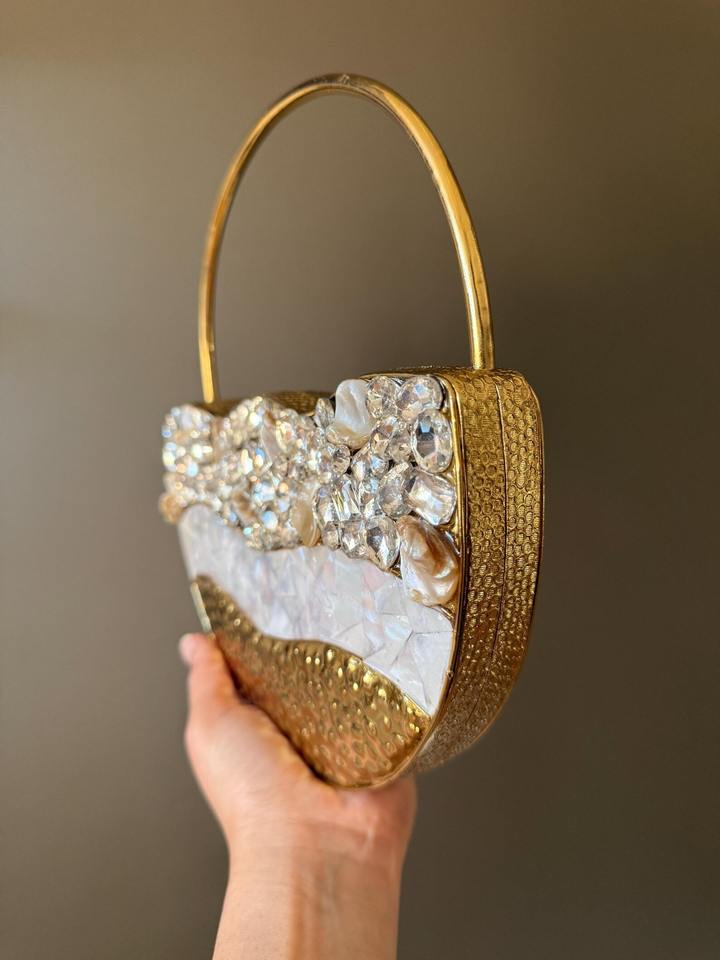 โซ่คลัทช์โลหะทองเหลืองประดับมุกระดับพรีเมี่ยมกระเป๋าถือแฟชั่นแบบคลาสสิกประดับเปลือกหอยระยิบระยับสำหรับงานเลี้ยงตอนเย็น