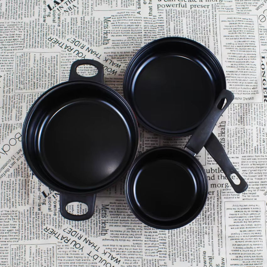 ชุดเครื่องครัวเคลือบกันติดแบบพรีเมียม 3 ชิ้น ประกอบด้วยกระทะทอด กระทะผัด และหม้อตุ๋น คุณภาพสูง ขายส่ง