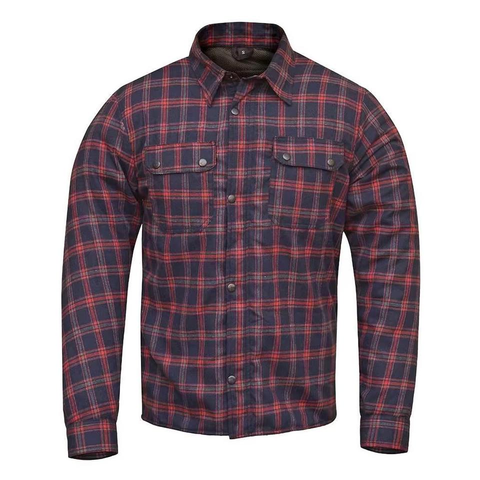 เสื้อเชิ้ตผู้ชายแบบพรีเมียม OEM ผ้าแฟลนเนลลายสก็อต กันน้ำ สำหรับขี่มอเตอร์ไซค์ พร้อมกระเป๋าอเนกประสงค์