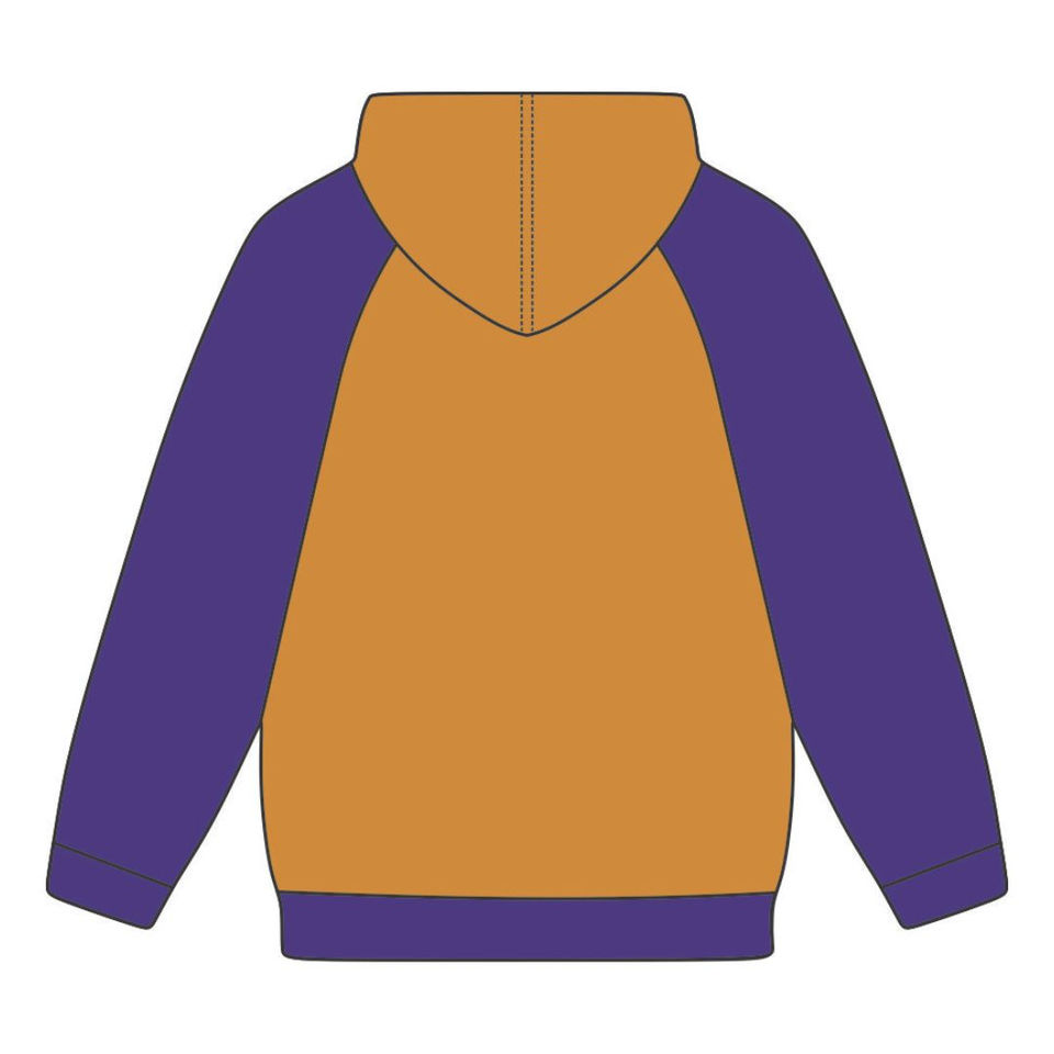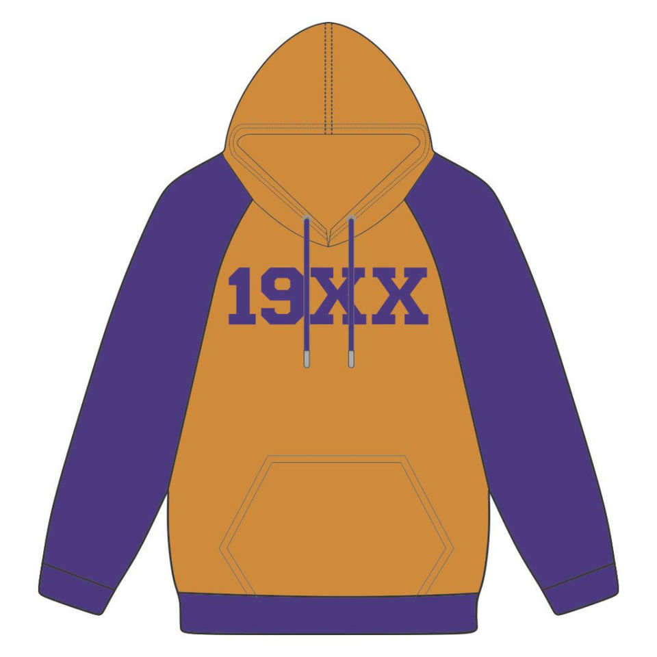 เสื้อฮู้ดพรีเมียมโอเมก้า ฟราตริตี้ สีทองโบราณ พร้อมแขนเสื้อสีม่วงแบบแร็กแลน ปักโลโก้ด้วยไหมเชนิลล์ ปีก่อตั้ง 19XX