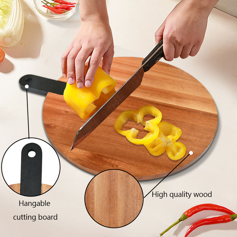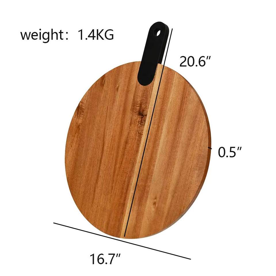 เขียงไม้อะคาเซียออร์แกนิกพร้อมด้ามสีดำกระดานพิซซ่าทรงกลมขนาดใหญ่