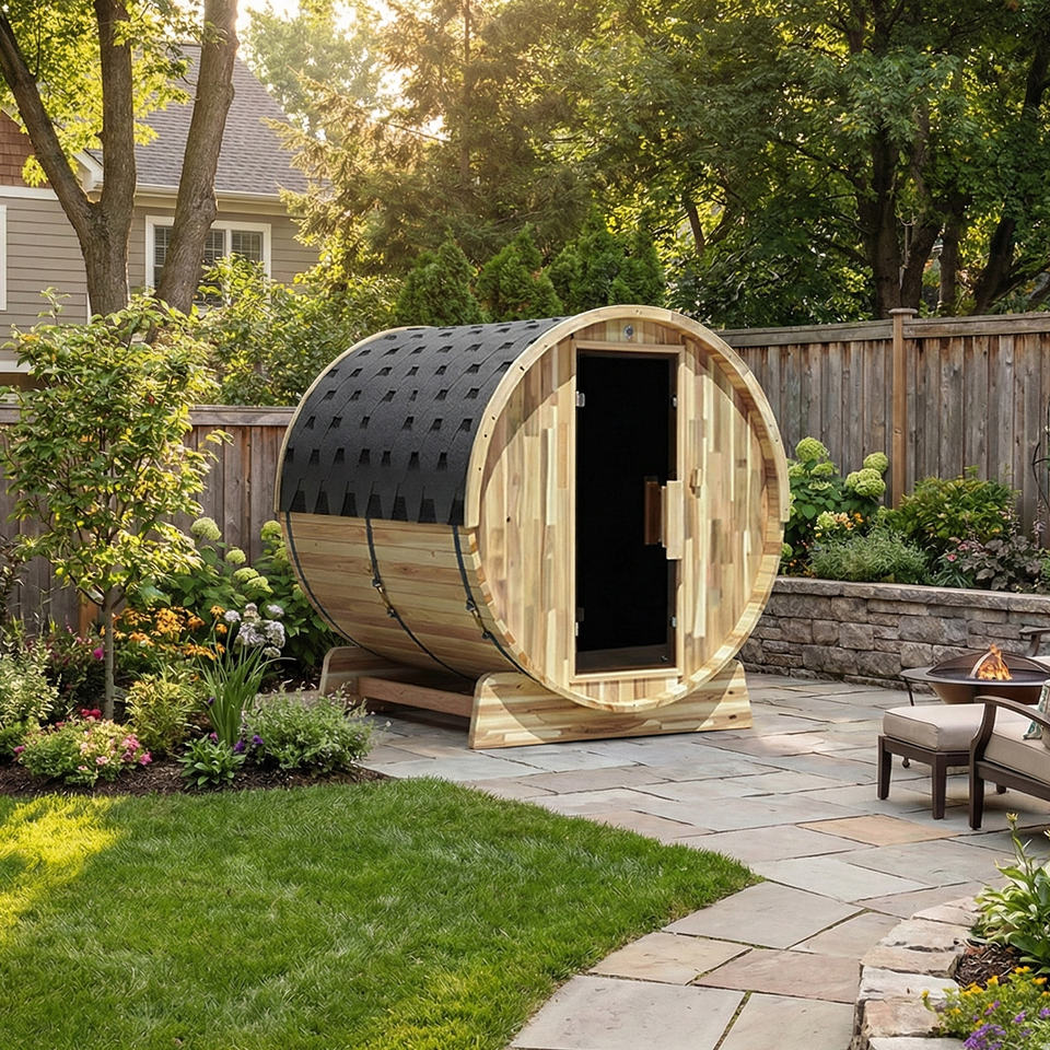 ซาวน่ากลางแจ้งทรงกระบอกไม้ซีดาร์แดงคุณภาพพรีเมียม ทันสมัย เป็นมิตรกับสิ่งแวดล้อม พร้อมประตูกระจก ไม่ต้องใช้ไฟฟ้า