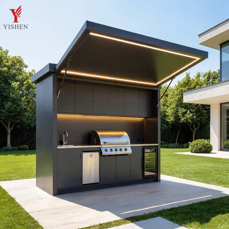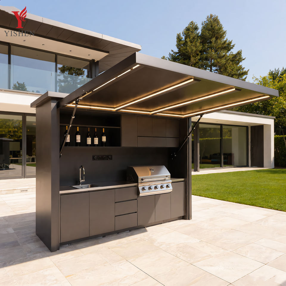 ตู้ครัวกลางแจ้งระดับพรีเมียมพร้อมเตาบาร์บีคิวแก๊สแบบโมดูลาร์สั่งทำพิเศษ ตู้เก็บของแบบหรูหราในตัวพร้อมระบบไฟฟ้าแบบพับเก็บได้สำหรับบ้านพักตากอากาศ