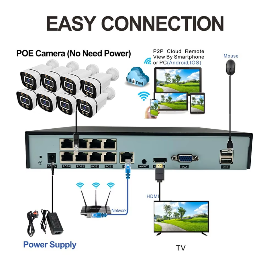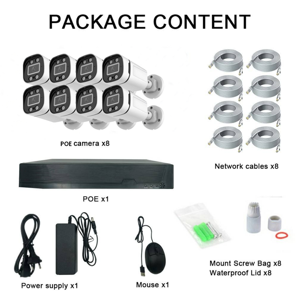 POE กล้อง IP เครือข่าย HD แบบ POE ชุดเซตระบบรักษาความปลอดภัยชุดกล้องหัวกระสุน4MP 8MP 4K พร้อมกล้องวงจรปิด4CH 8CH NVR