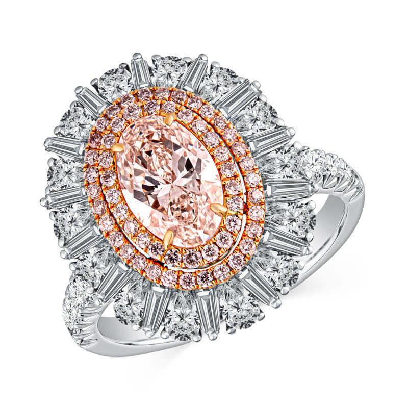 ชุดแหวนหมั้นเพชรสองชั้นทรงรีแบบพรีเมี่ยมสีชมพูประดับเพชรวงแหวนคู่สีทอง6Ct เพชรโมอิสซาไนต์10K เครื่องประดับงานแต่ง