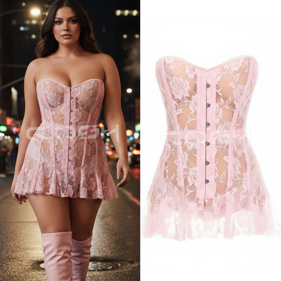 คอร์เซ็ททรงโอเวอร์บัสต์พรีเมียม โครงเหล็กเสริม ผ้าลูกไม้สีชมพู ขายดีที่สุด ปรับได้ ไม่มีสายรัด เหมาะสำหรับงานปาร์ตี้ จากผู้ขายคอร์เซ็ทชั้นนำ