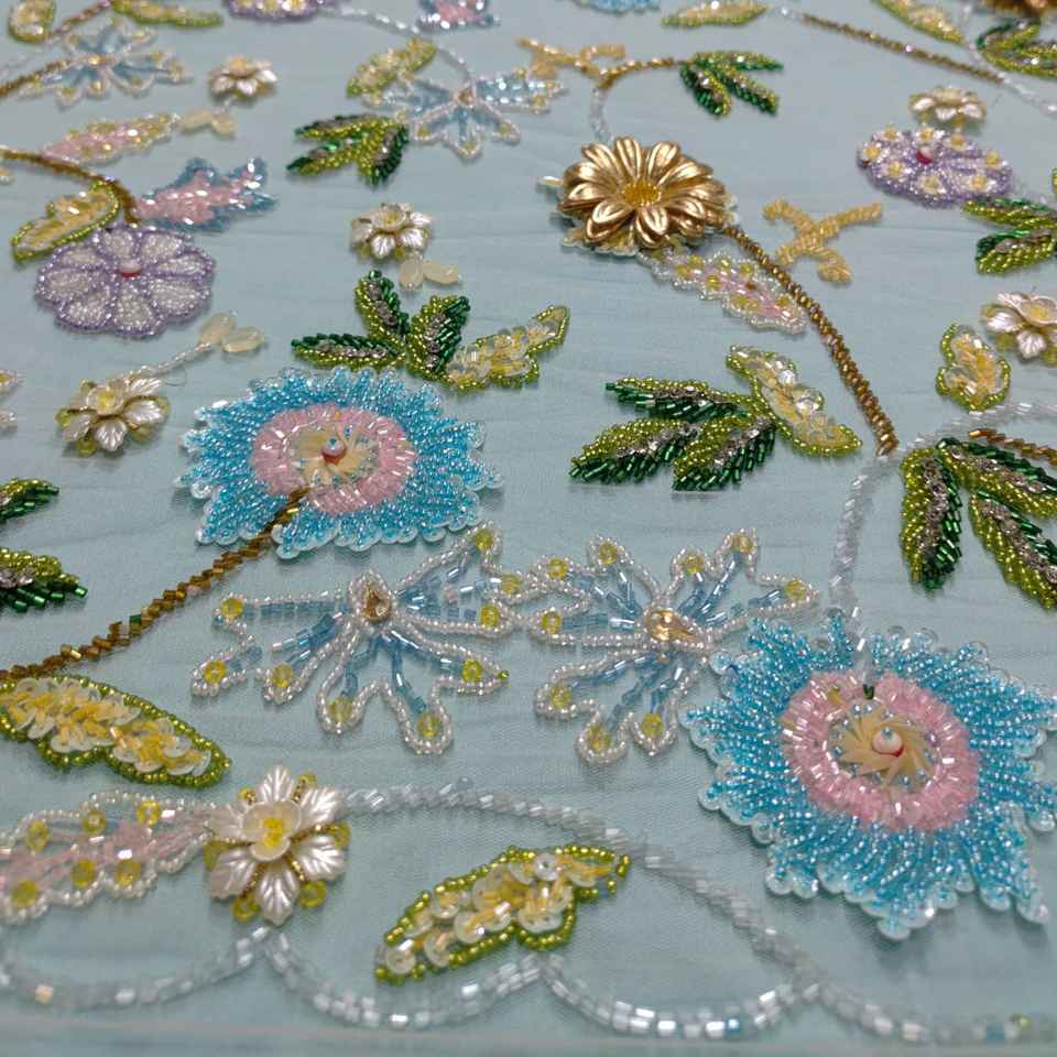 ผ้าลูกไม้สีฟ้าพาสเทลพรีเมียมสำหรับเจ้าสาว งานปักมืออย่างดี ราคาโรงงานโดยตรง