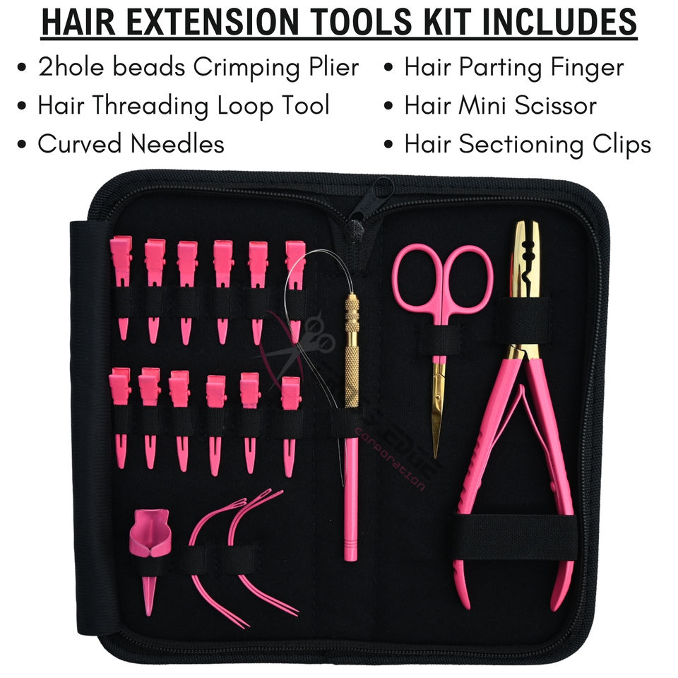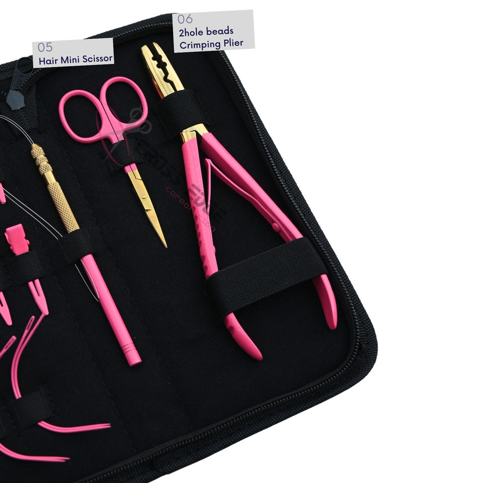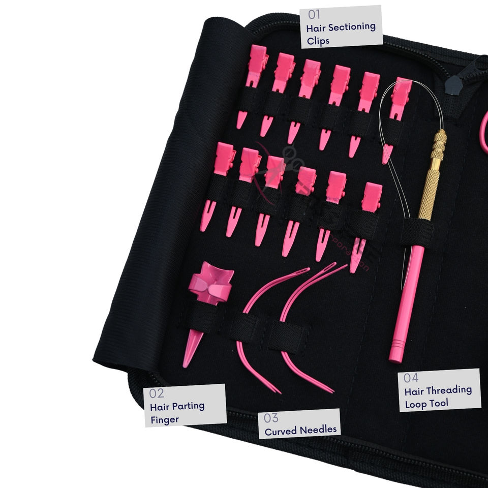 ชุดอุปกรณ์ต่อผมสีชมพูพรีเมียม พร้อมคลิปแบ่งผมแบบมืออาชีพ เข็มเกี่ยวแบบโค้ง ที่ร้อยเชือก ที่หนีบผมแบบ 2 รู และคีมหนีบผม
