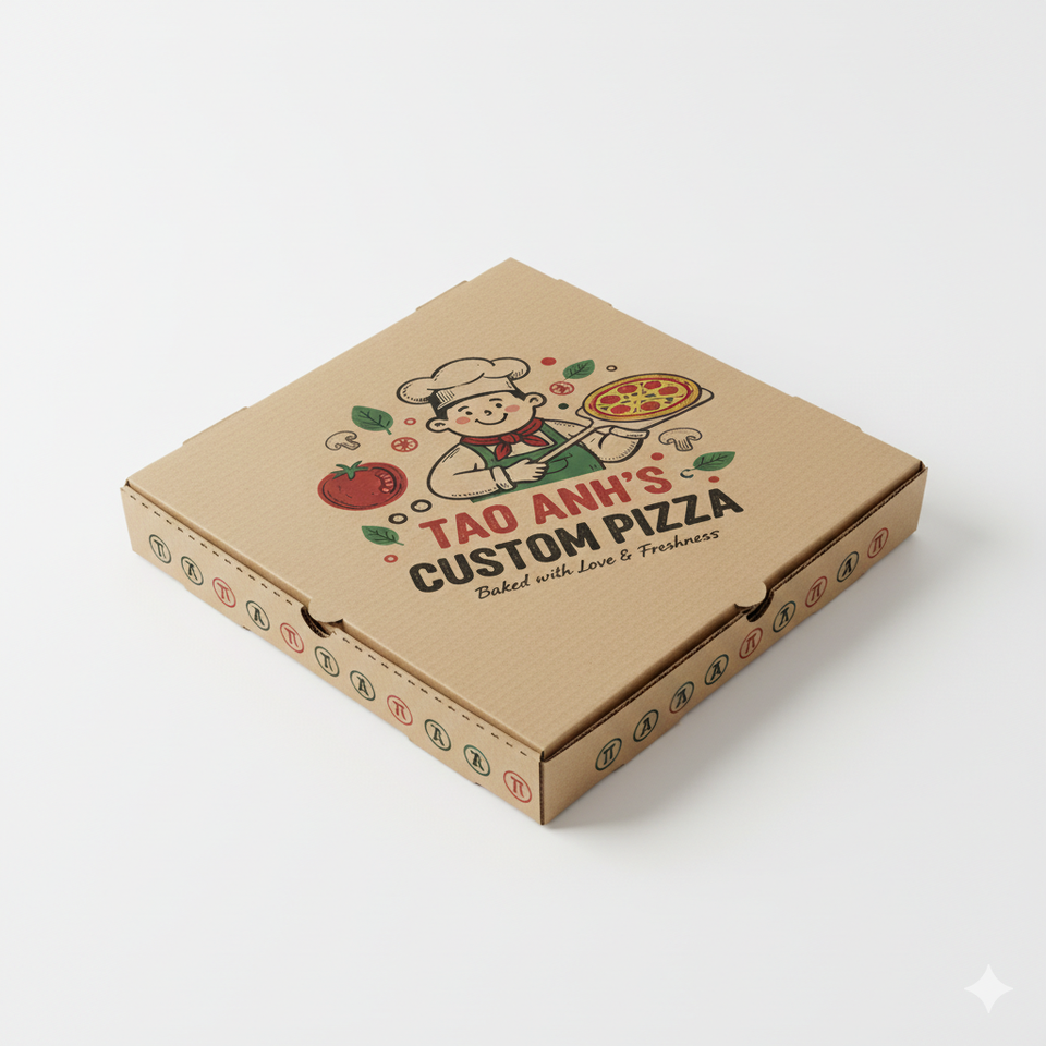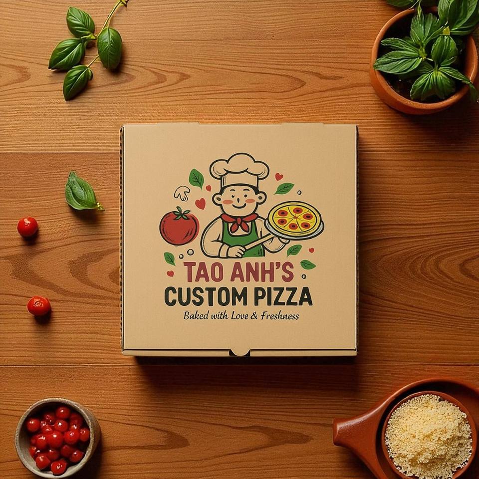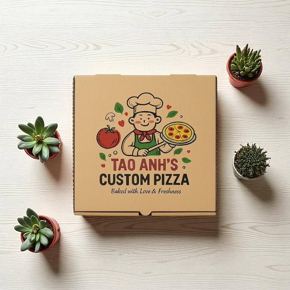 บรรจุภัณฑ์กล่องพิซซ่ากล่องกระดาษคราฟท์พิมพ์ลายตามสั่งสำหรับจัดส่งกลับบ้าน