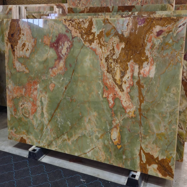 แผ่นหินอ่อนออนิกซ์สีเขียวและสีน้ำเงินแปลกตาคุณภาพพรีเมียมขัดเงาสำหรับตกแต่งห้องนอน ห้องน้ำ และห้องรับประทานอาหารระดับไฮเอนด์