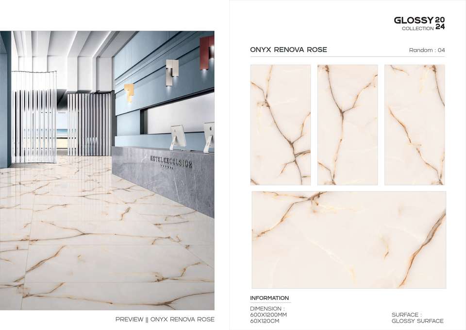 กระเบื้องพอร์ซเลนเคลือบเงาคุณภาพพรีเมียม ขนาด 600x1200 มม. ผิวมันเงาสูง เหมาะสำหรับปูพื้นภายในอาคาร ใช้ได้กับโครงการก่อสร้างสมัยใหม่