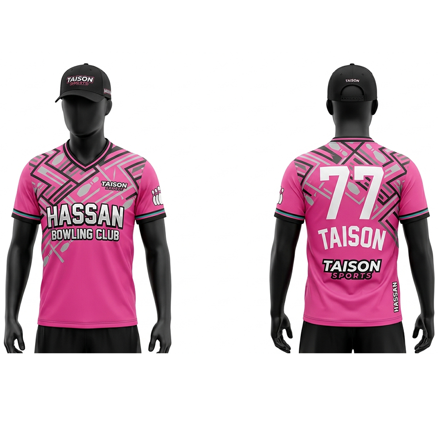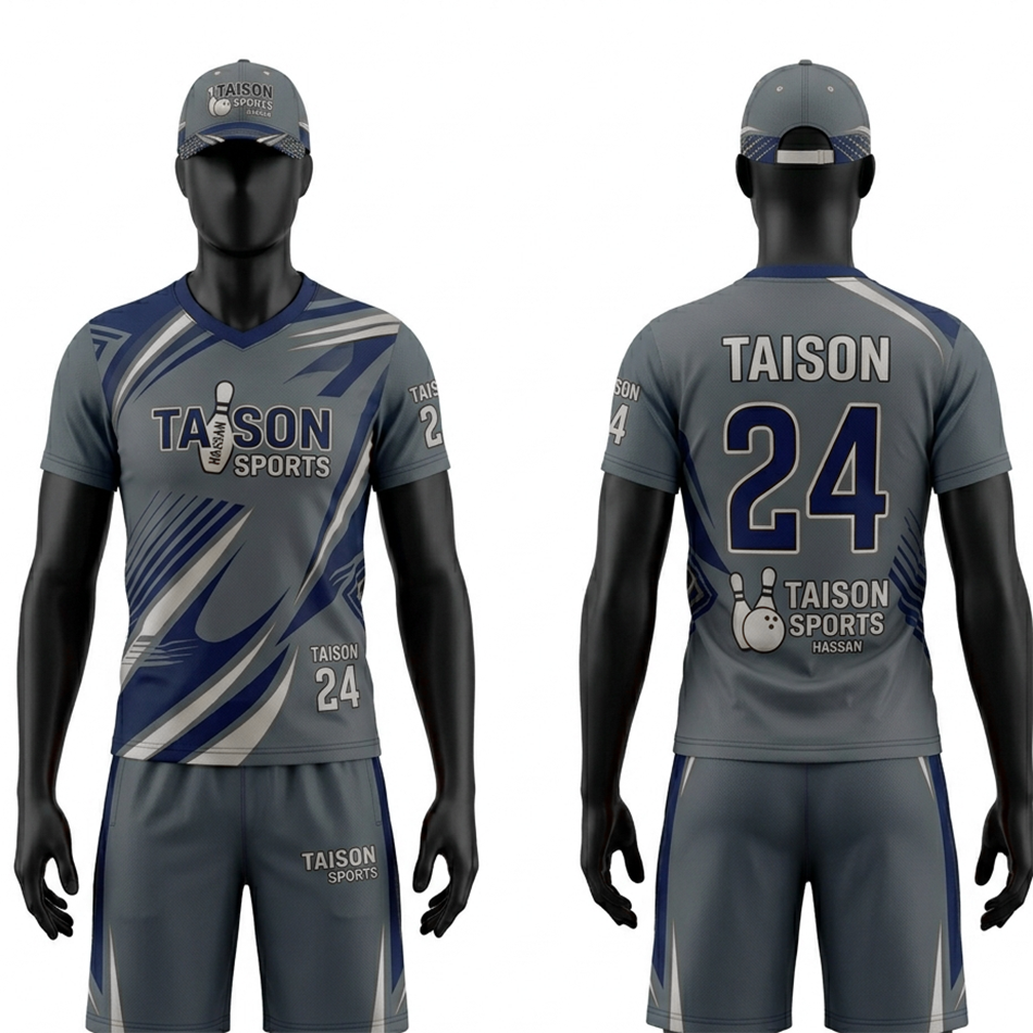 เสื้อโบว์ลิ่งโพลีเอสเตอร์พรีเมียมสำหรับผู้ชาย สีเทา-น้ำเงิน พิมพ์ลายแบบซับลิเมชั่น ดีไซน์แผงแบบไดนามิก โลโก้สั่งทำได้ ระบายอากาศได้ดี ทรงพอดีตัว