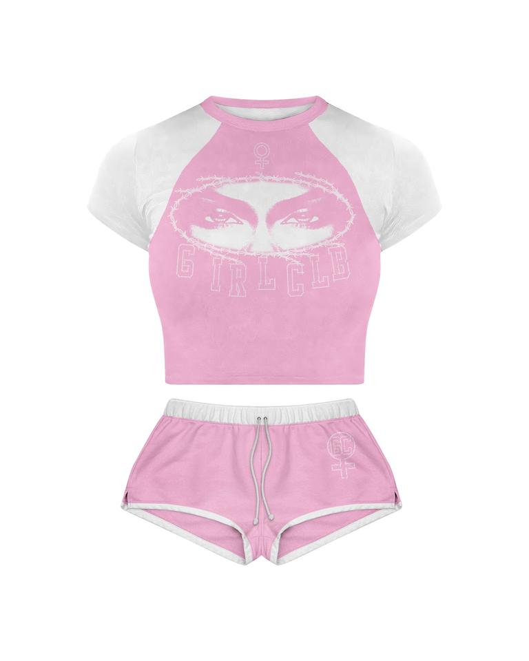 ชุดเซ็ตเสื้อครอปท็อปสีขาวแต่งแผงผ้าพร้อมกางเกงขาสั้นบั้นท้ายทรงกระชับ ผลิตจากโพลีเอสเตอร์ผสมอีลาสเทนอย่างดี พร้อมเสื้อยืดผ้าฝ้าย 100% และกางเกงขาสั้นบั้นท้าย สามารถสกรีนโลโก้ได้ตามต้องการ