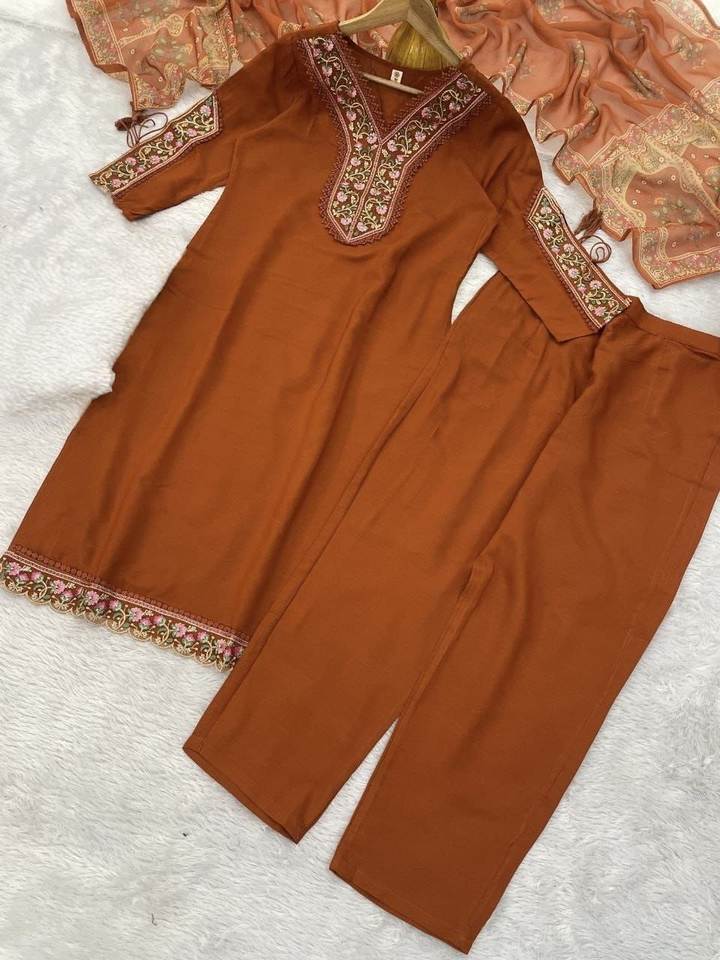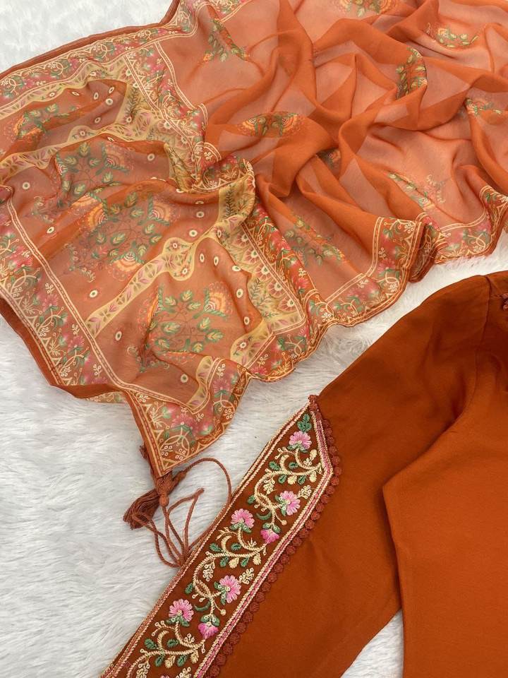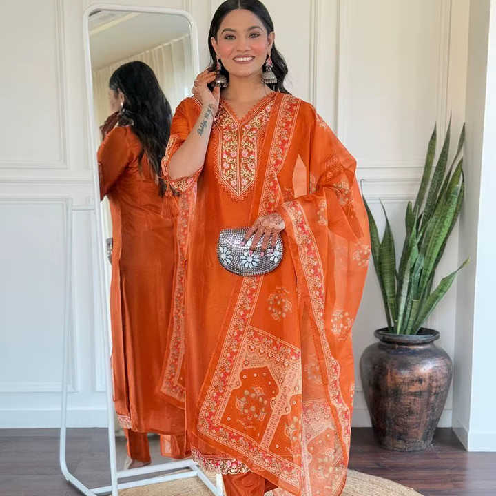 Premium Pure BSY Roman Silk Sequence Embroidery Top BSY Bottom Organza Dupatta Kurti 44 Plus Inch