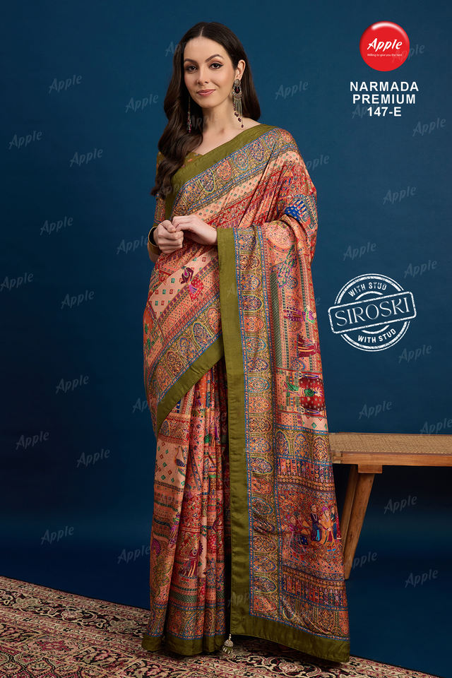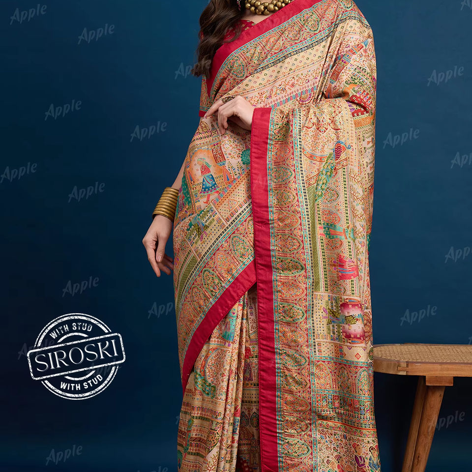 ผ้าส่าหรีผ้าไหมโดลาแบบพรีเมี่ยมพร้อมกระดุมจากสวารอฟสกี้ชุดใส่ทำงานในตำแหน่งที่หรูหราออกแบบการพิมพ์สำหรับงานแต่งงาน