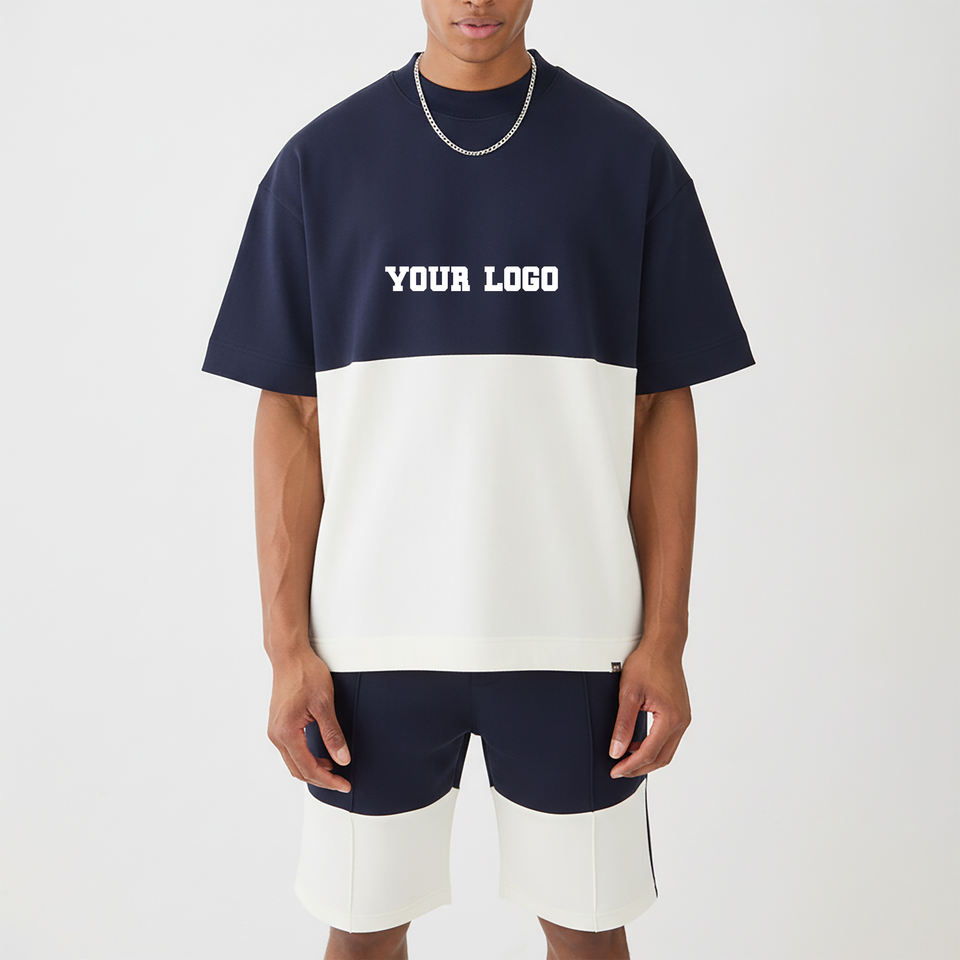เสื้อยืดแขนสั้นคุณภาพพรีเมียม ผ้าฝ้าย 100% ระบายอากาศได้ดี ดีไซน์สีตัดต่อแบบแผง ชุดเซ็ต 2 ชิ้น ทรงโอเวอร์ไซส์ แฟชั่นสำหรับผู้ชาย