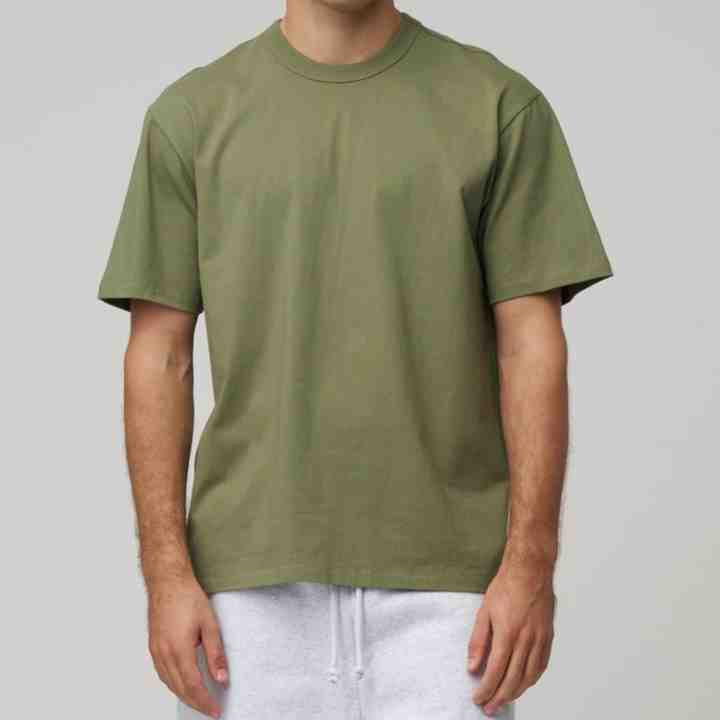 เสื้อยืดคุณภาพพรีเมียม ผ้าฝ้าย 100% ผลิตขายส่ง สกรีนลายตามสั่ง สีเขียวมะกอก ทรงปกติ ไม่หดตัว
