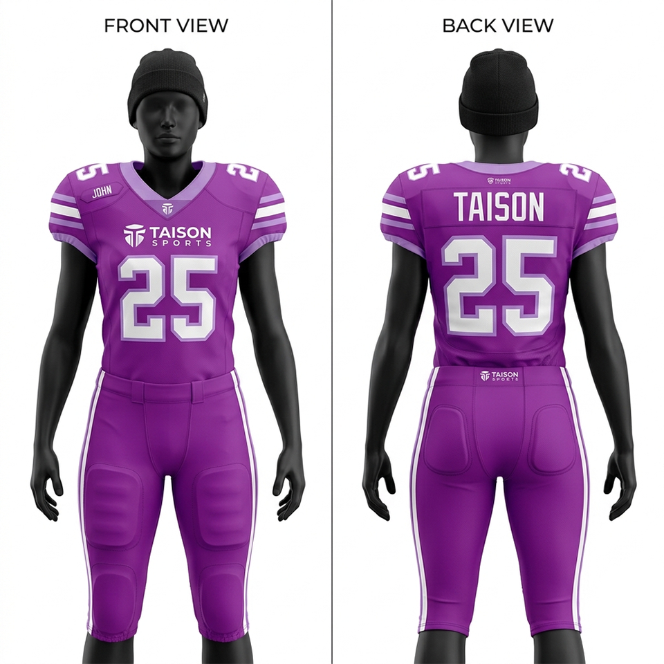 ชุดยูนิฟอร์มอเมริกันฟุตบอลหญิง คุณภาพพรีเมียม ผ้าโพลีเอสเตอร์ยืด 280 GSM สีม่วง ระบายเหงื่อได้ดี พร้อมแผงผ้าแบบพิเศษ สามารถสั่งทำโลโก้ได้