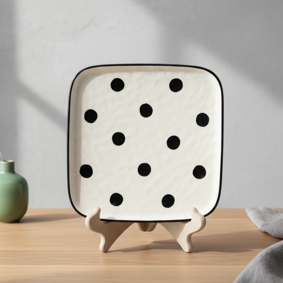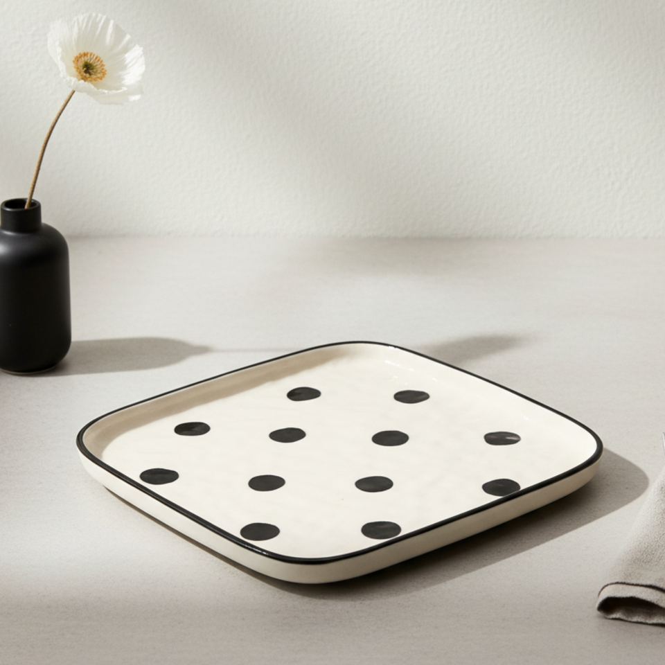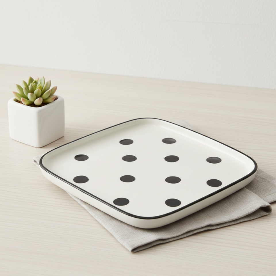 จานสโตนแวร์คุณภาพพรีเมียม 3460898-20.5X20.5 ขนาด 8 นิ้ว รูปทรงสี่เหลี่ยม ตกแต่งลายวงกลมสีดำ
