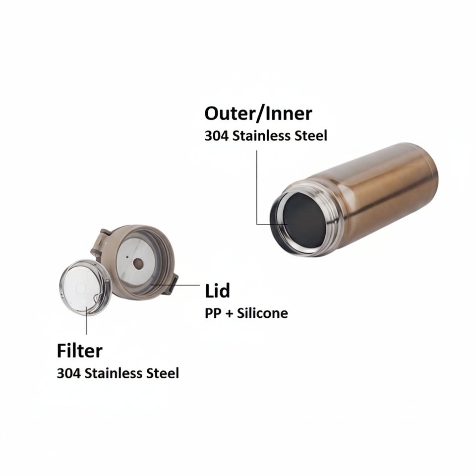 ด้านใน/ด้านนอก/ไส้กรอง-SUS304, ฝา-PP + ซิลิโคน