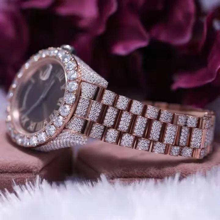 นาฬิกาหน้าปัดกระจกอะนาล็อกคุณภาพสูงสำหรับวันที่วันที่วันที่ทำจากสเตนเลสสตีลประดับเพชรสีโรสโกลด์