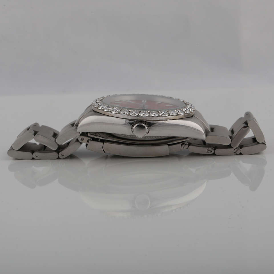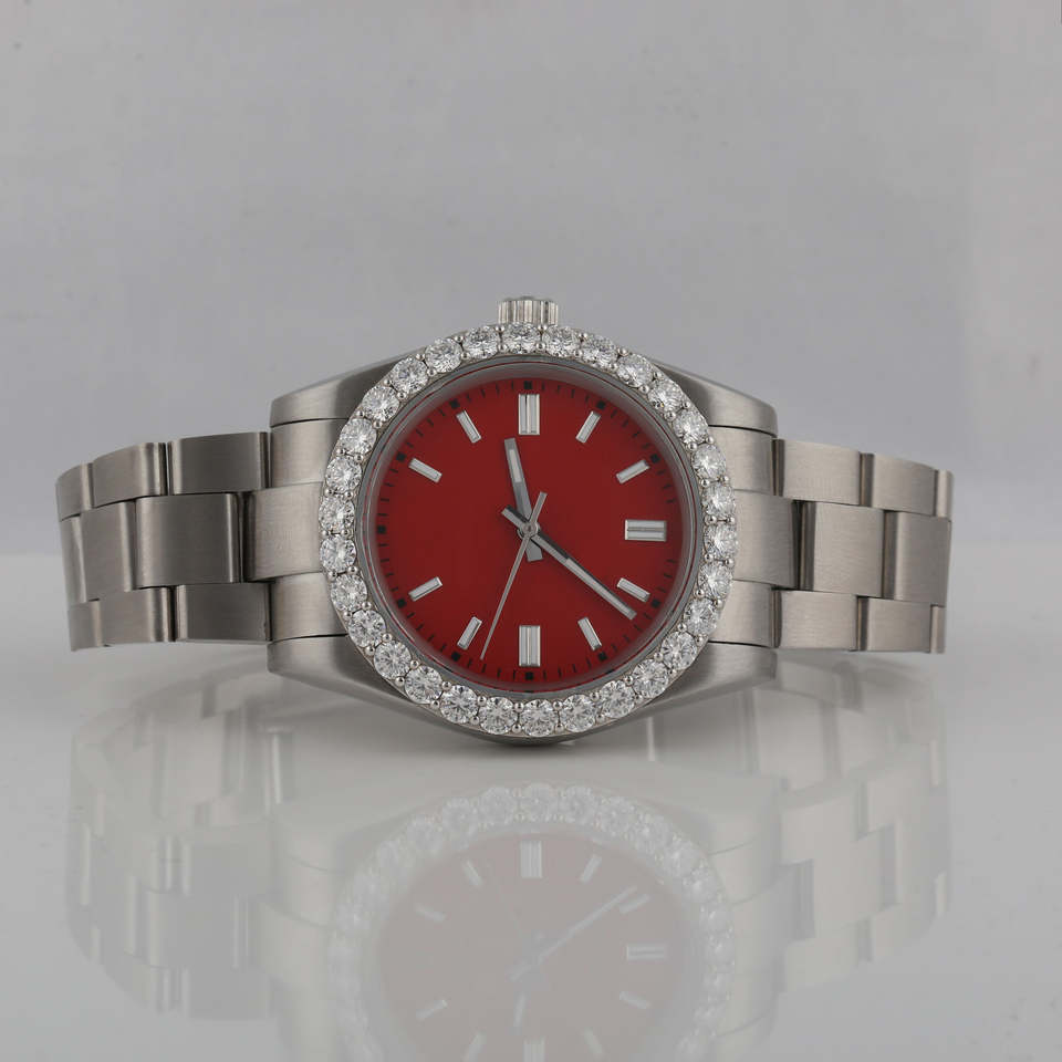 นาฬิกาข้อมือสแตนเลสสตีล ระบบกลไกแบบอนาล็อก หน้าปัดสีแดง ขอบหน้าปัดคุณภาพพรีเมียม ดีไซน์หรูหราแบบฮิปฮอป ประดับเพชรเต็มหน้าปัด