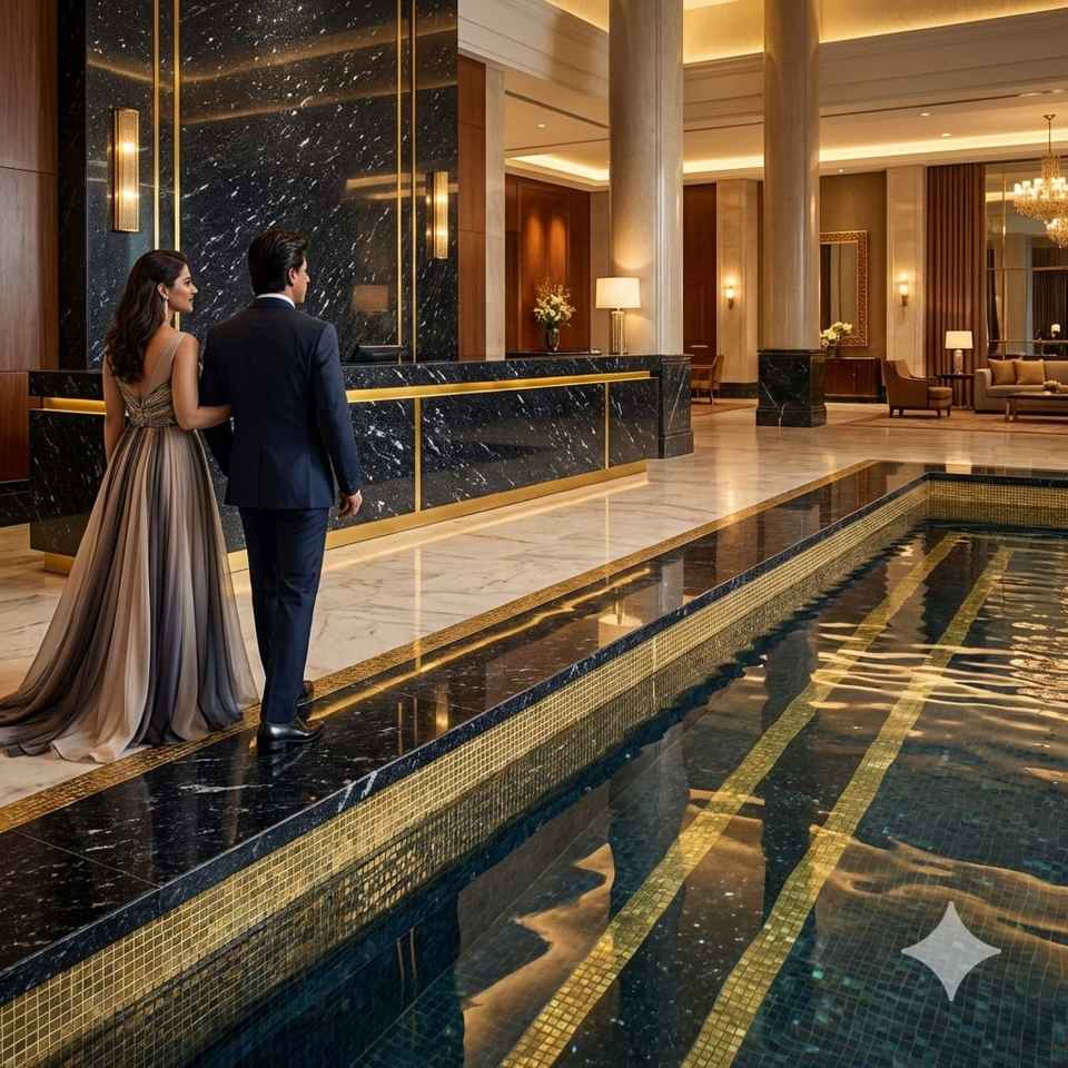 หินแกรนิตสีดำลายคลื่นทะเลคุณภาพพรีเมียม แบบแผ่นขัดเงาและกระเบื้อง สำหรับปูพื้นล็อบบี้โรงแรมและบันได มีจำหน่ายแล้ว
