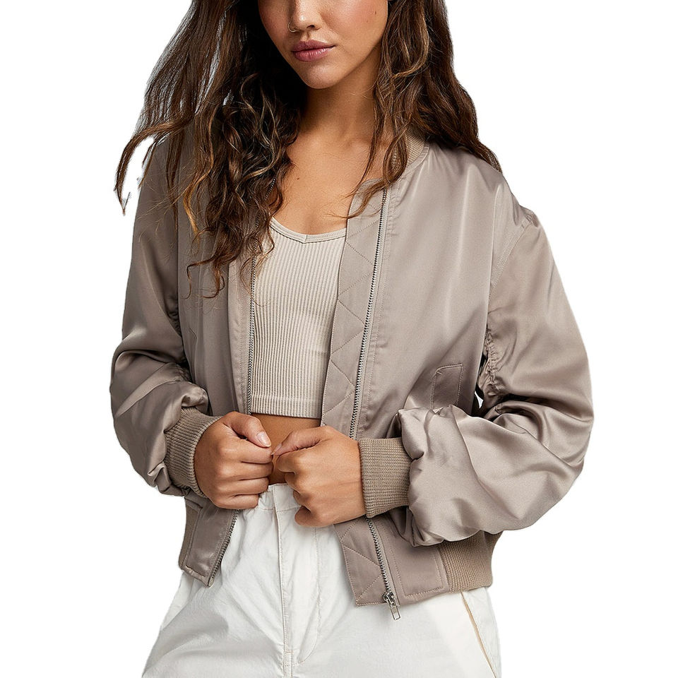 แจ็กเก็ตบอมเบอร์สำหรับผู้หญิงเสื้อแจ็คเก็ตสตรีทแวร์ผ้าโพลีเอสเตอร์100% ระบายอากาศได้ดีพิมพ์โลโก้ได้ตามต้องการ