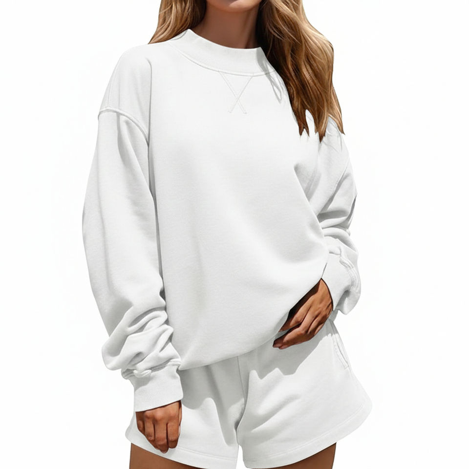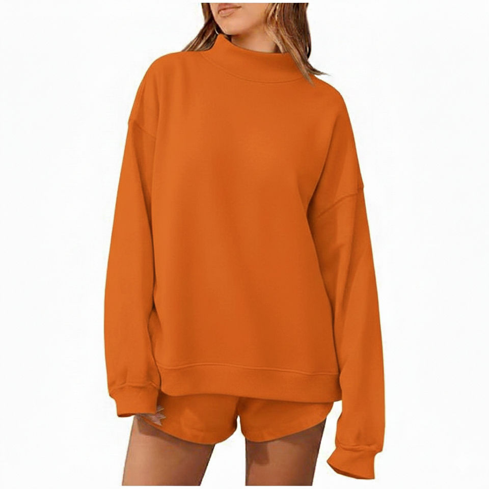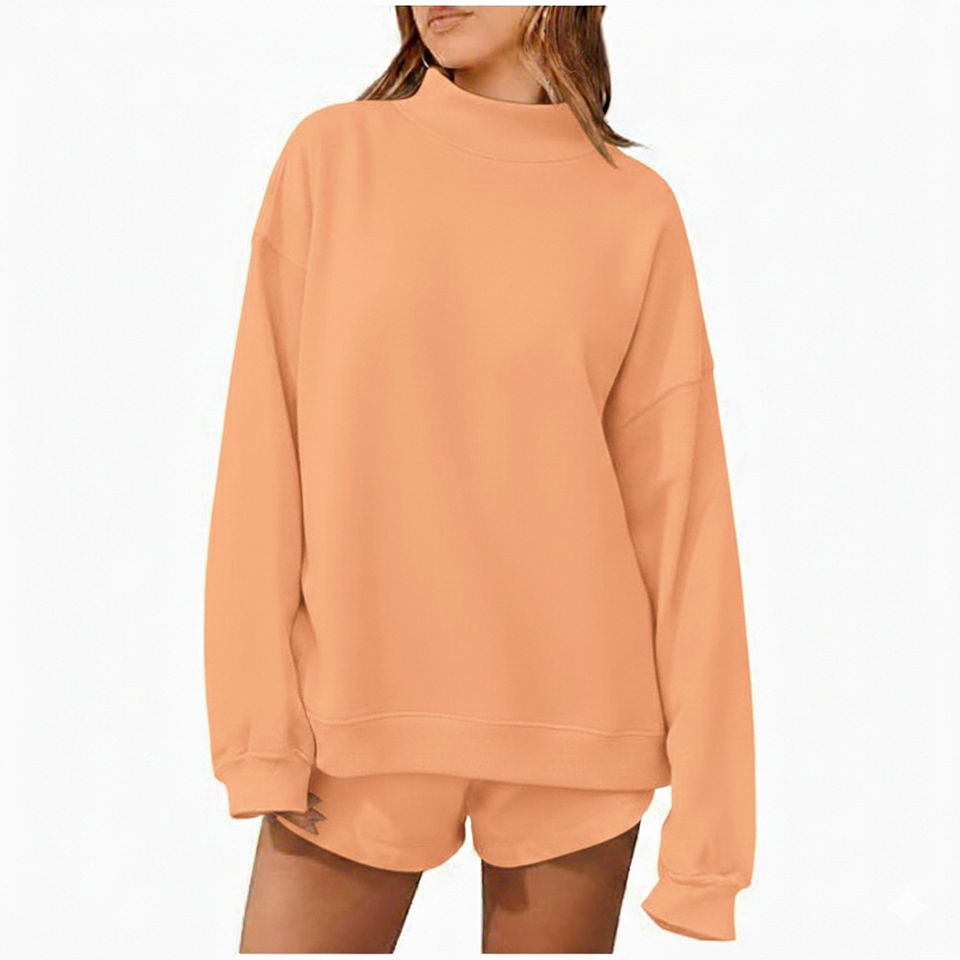 ชุดเซ็ตเสื้อแขนยาวคอเต่าทรงหลวมและกางเกงขาสั้นสำหรับผู้หญิง คุณภาพพรีเมียม ระบายอากาศได้ดี เป็นมิตรต่อสิ่งแวดล้อม เหมาะสำหรับฤดูใบไม้ร่วง/ฤดูหนาว รับสั่งทำได้