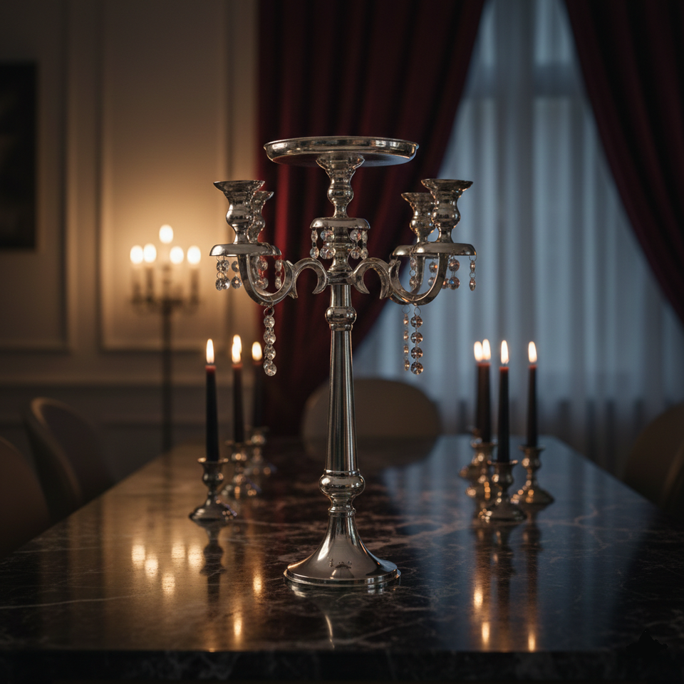 เชิงเทียนคุณภาพพรีเมียม 5 แขน พร้อมจานรองเทียน ประดับคริสตัลเม็ดเล็ก ตกแต่งโต๊ะ วัสดุโลหะ เป็นมิตรกับสิ่งแวดล้อม