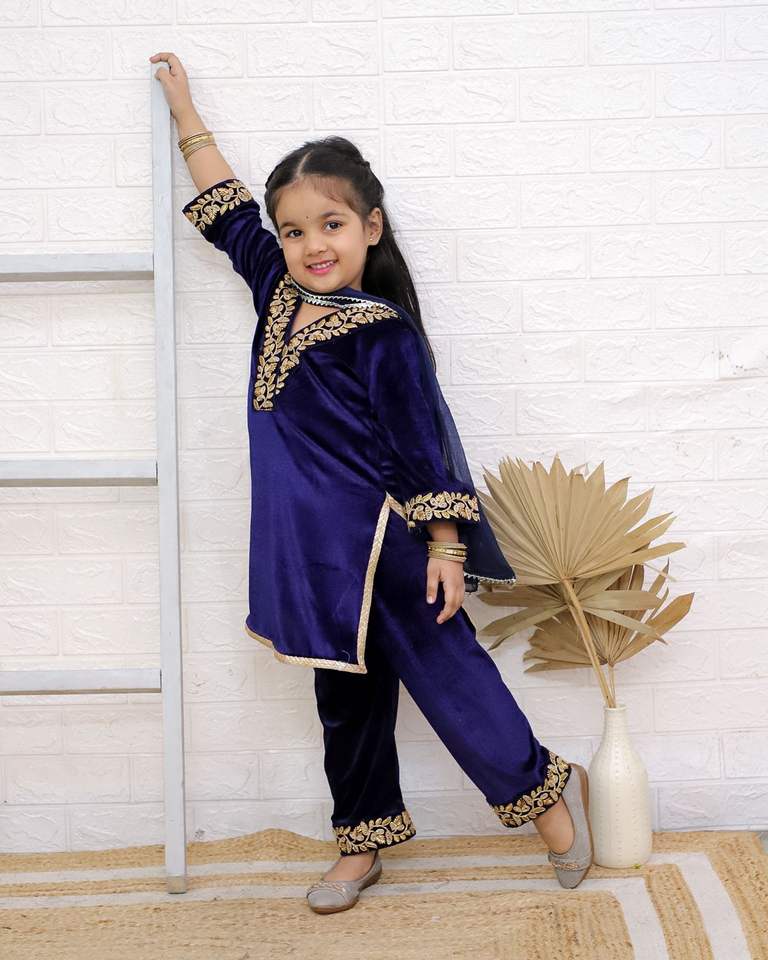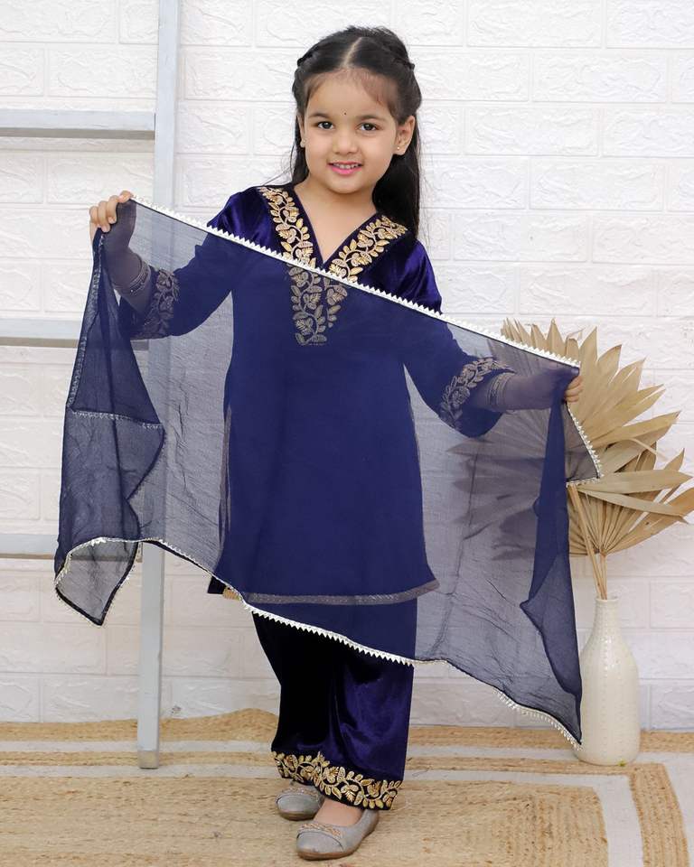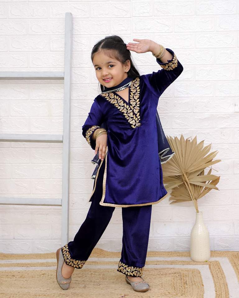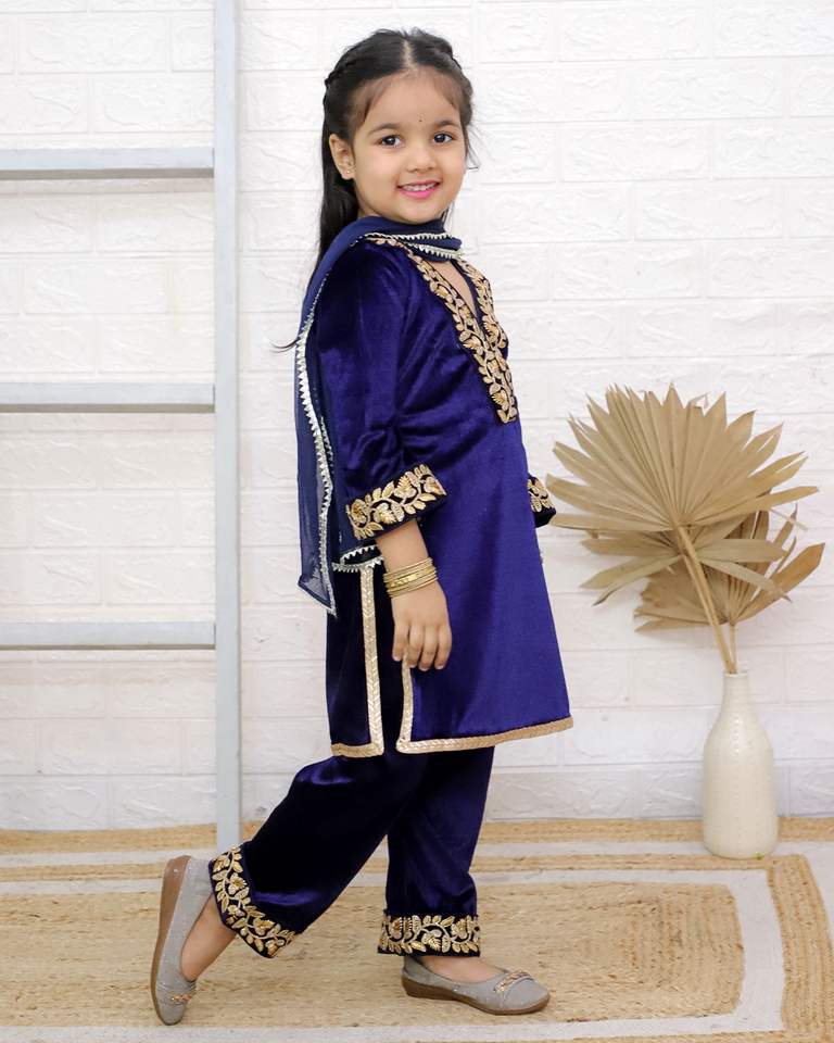 ชุดสูทเด็กคุณภาพพรีเมี่ยมสำหรับเด็กผู้หญิงตัวเล็กผ้ากำมะหยี่แท้ Gota คอปักลายพลาซโซดูพัตต้าชุดเคอร์ติ